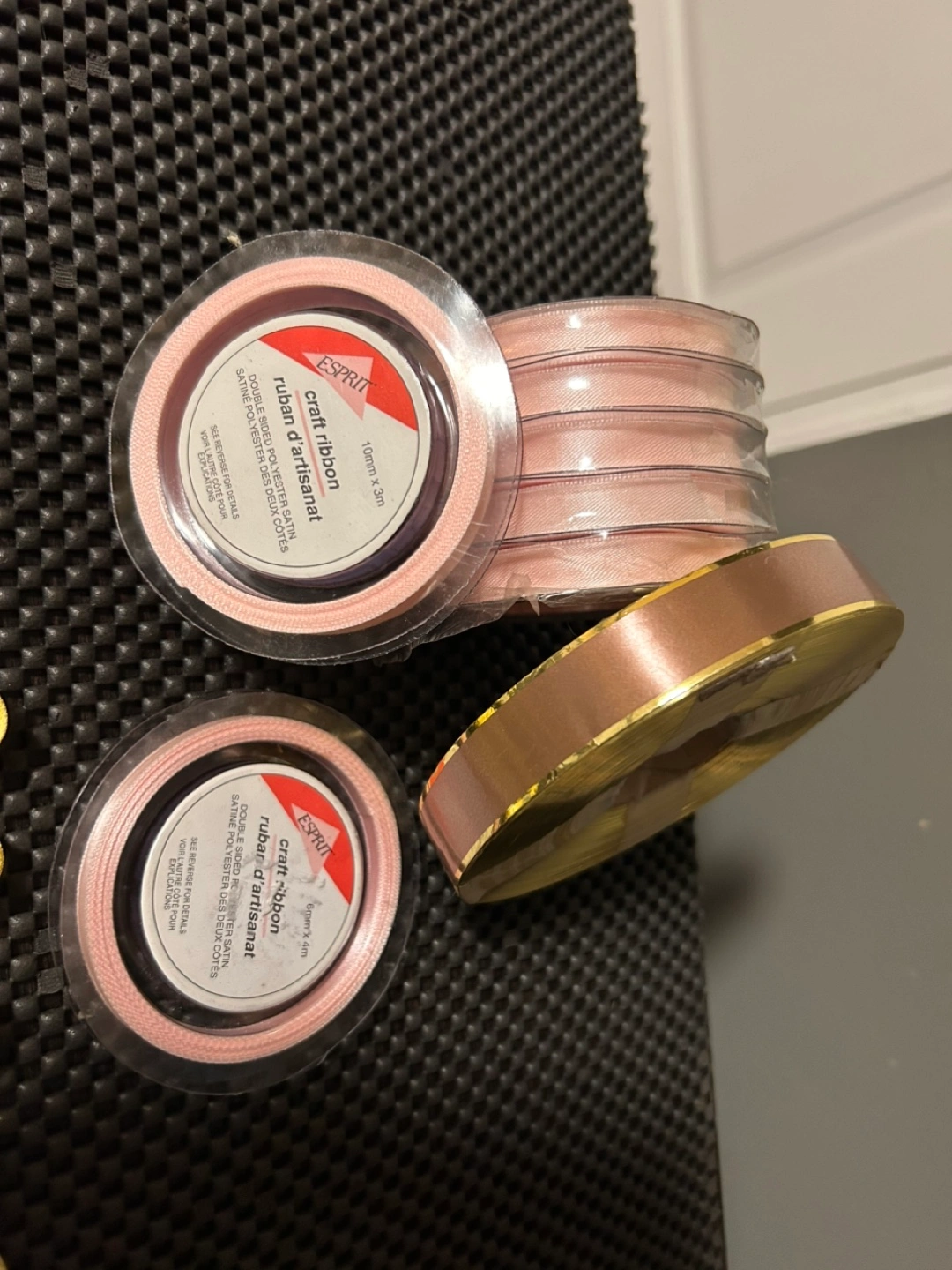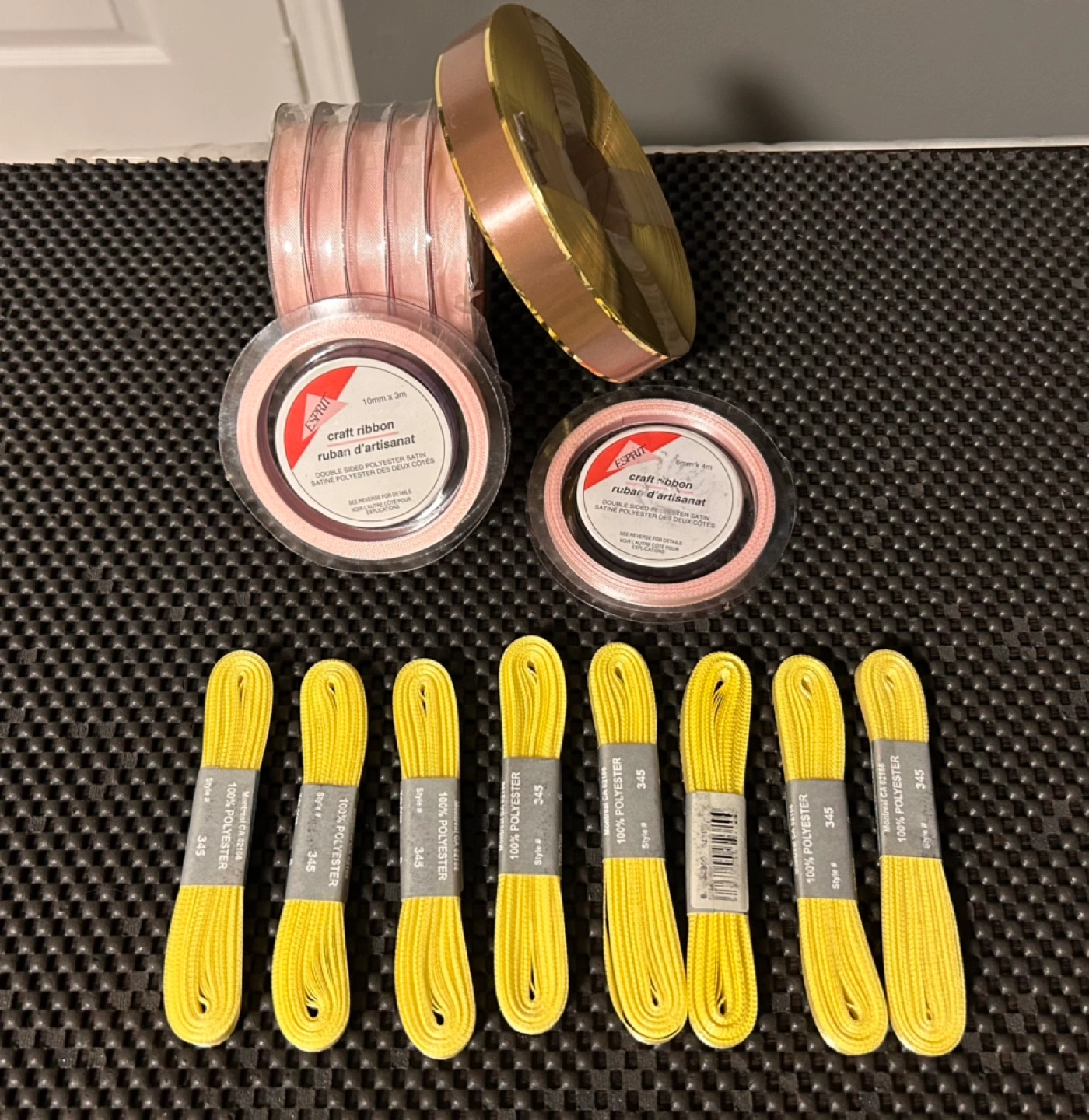 Eight spools of yellow ribbon and two rolls of pink ribbon