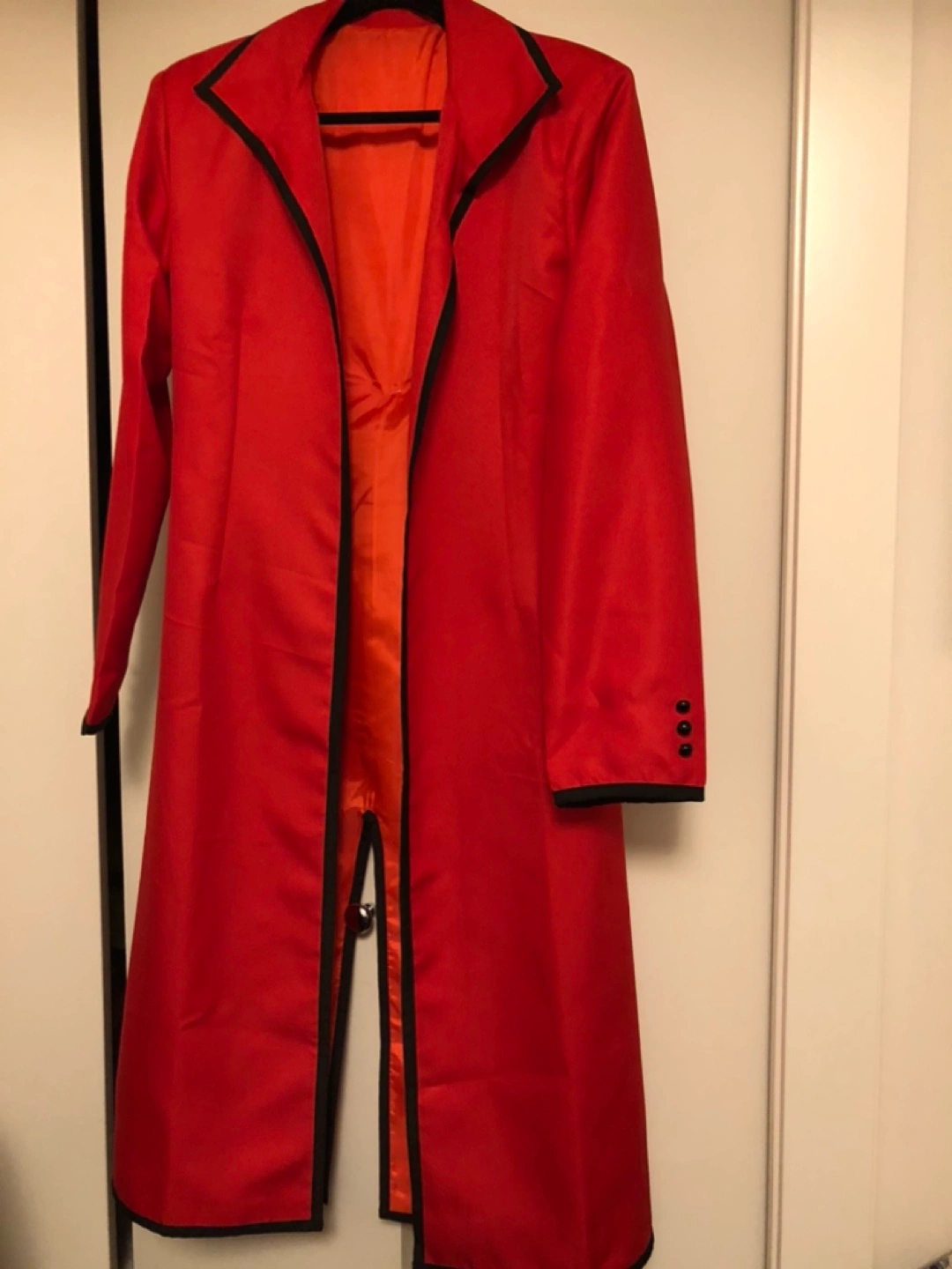 Long red coat, black trim, and a black satin bow on the back. Features long sleeves and a centre back vent. Three black buttons on the front. Excellent costume piece - Ringmaster