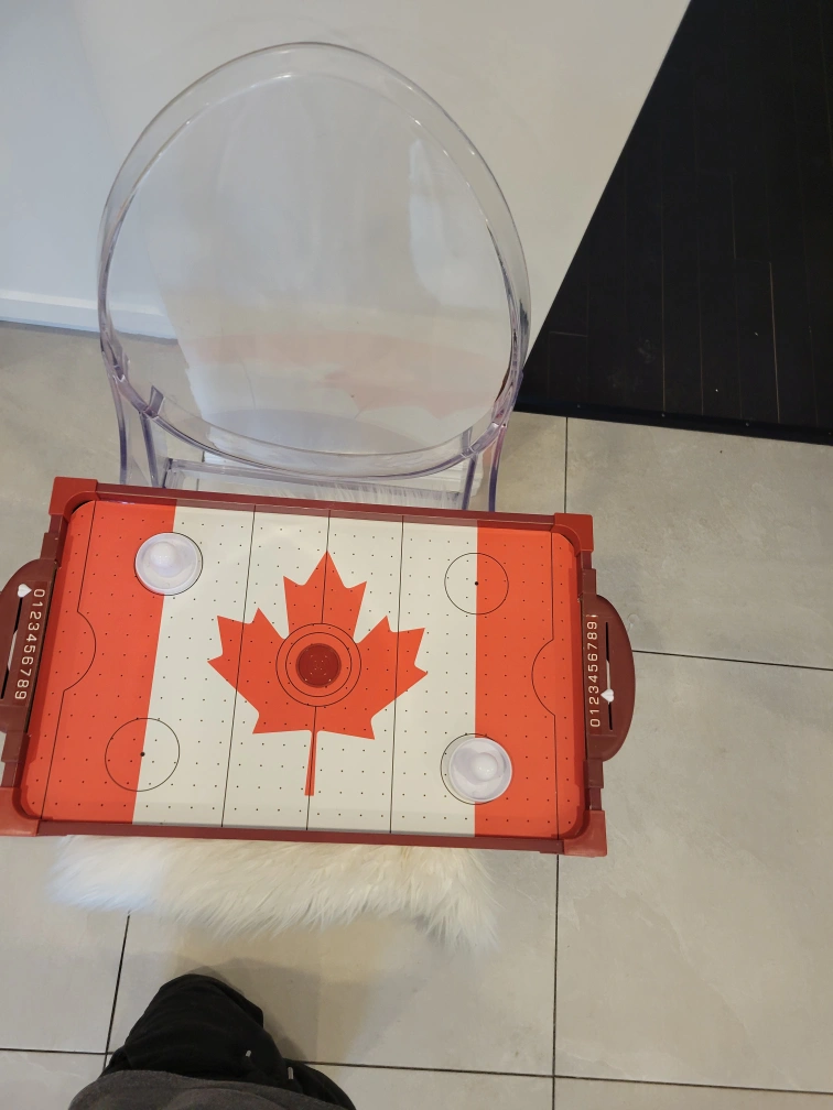 Portable tabletop air hockey game. Features a Canadian flag design. Includes strikers and pucks. Great for travel or small spaces.
