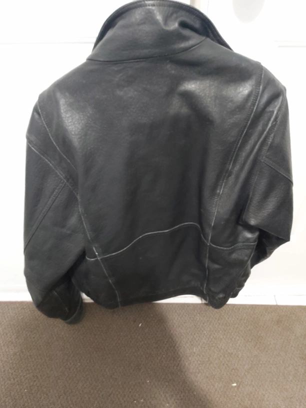 Classic black leather jacket. softer leather. Zip-up front. Size medium. Good condition.