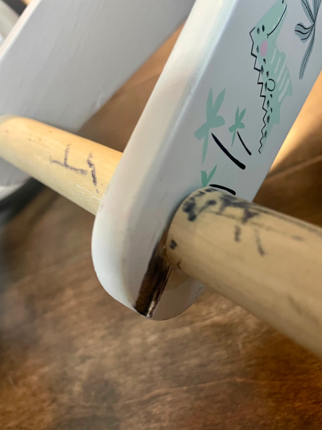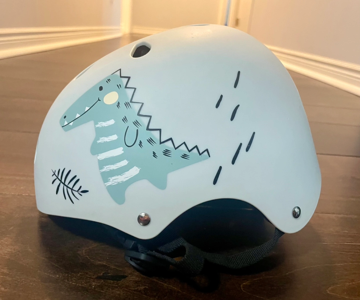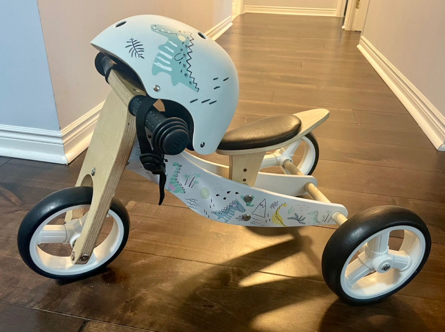 Wooden balance bike, dinosaur design. Includes matching helmet. Great for toddlers learning to balance.