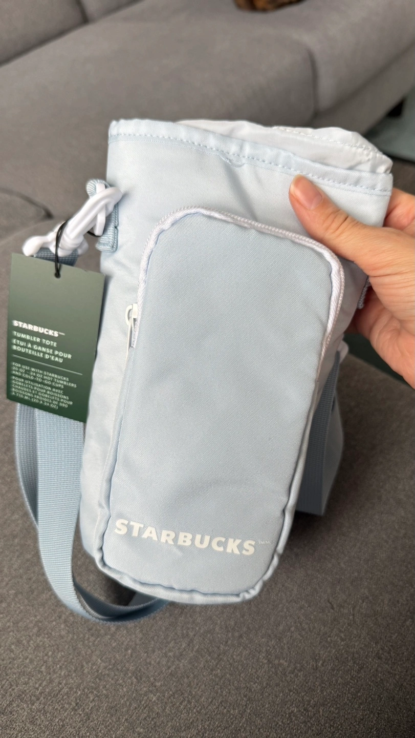 Starbucks tumbler tote. Light blue colour. Small shoulder bag. Designed for Starbucks tumblers. Has tags on it.