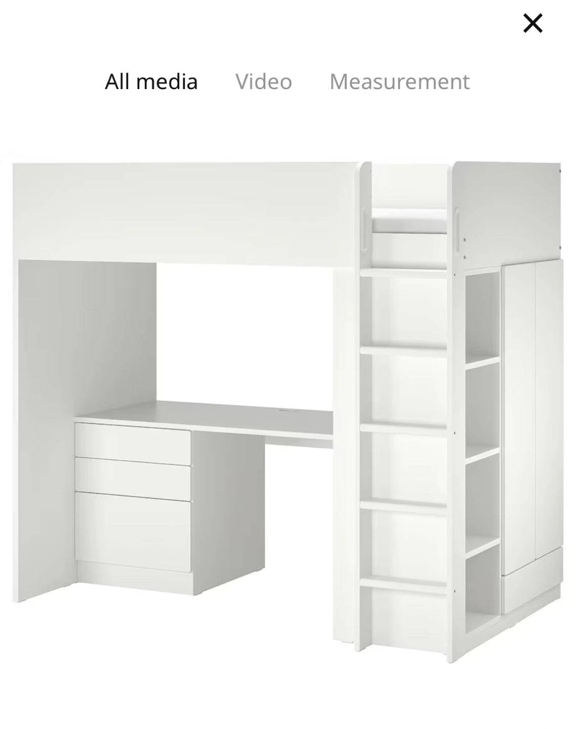 High sleeper bed, built-in desk, and wardrobe. Lots of storage. Perfect for a child's bedroom! Great condition with tiny little scratches and little holes from the closet because we changed the handle. It’s all completely white.