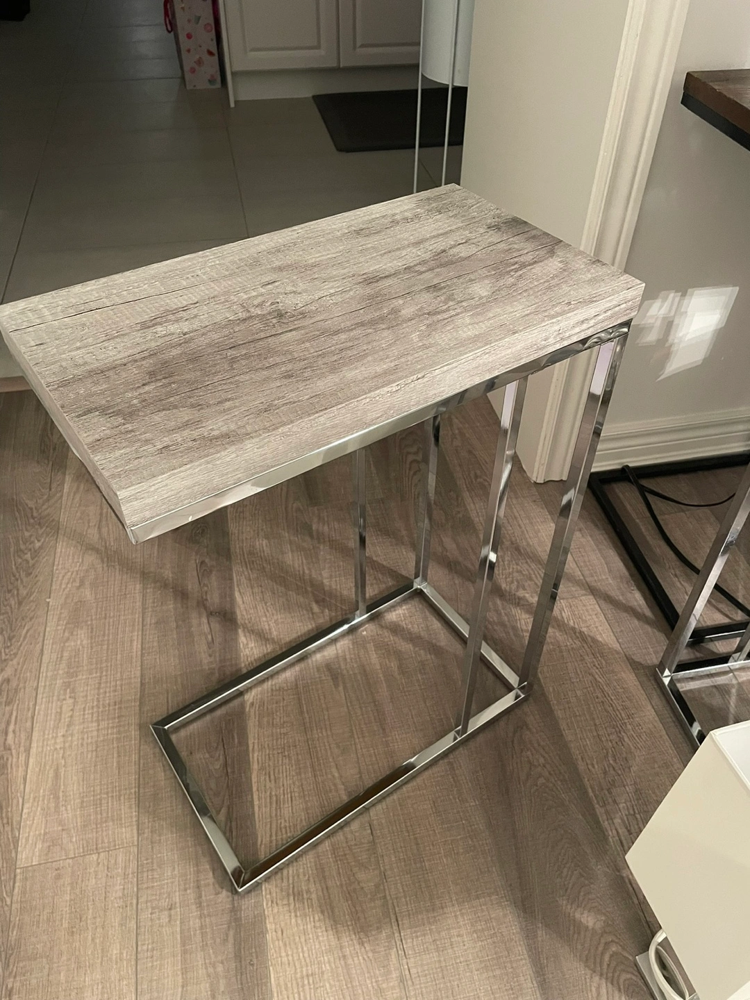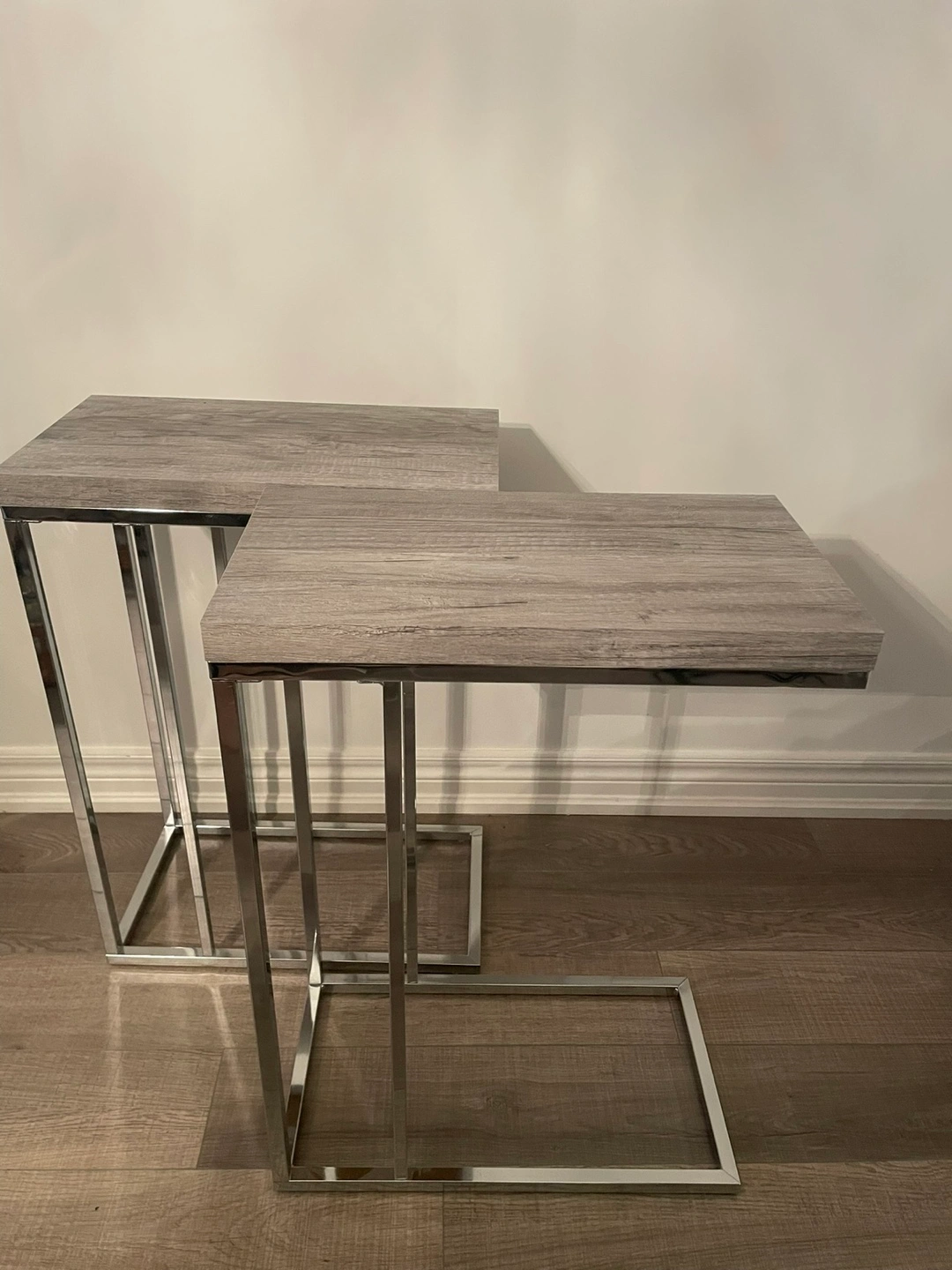 Set of two grey wood top and chrome metal frame side tables. Sleek and contemporary design. Perfect for living room or bedroom.