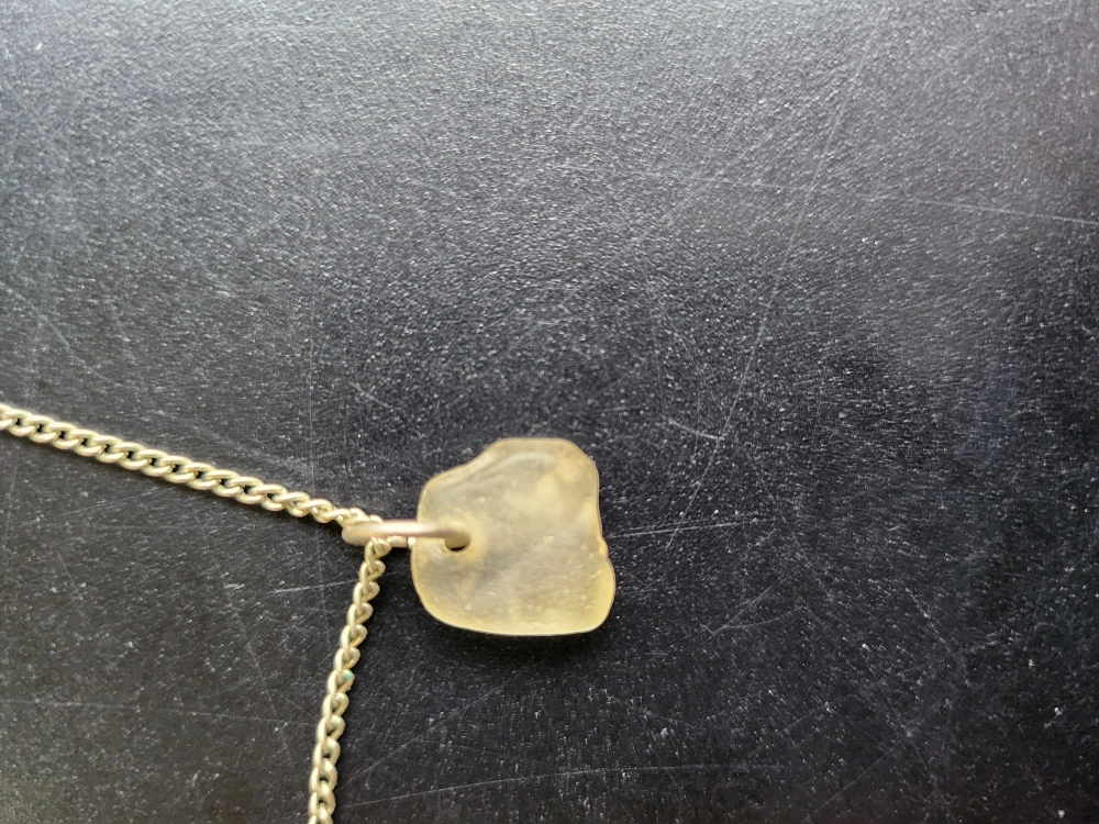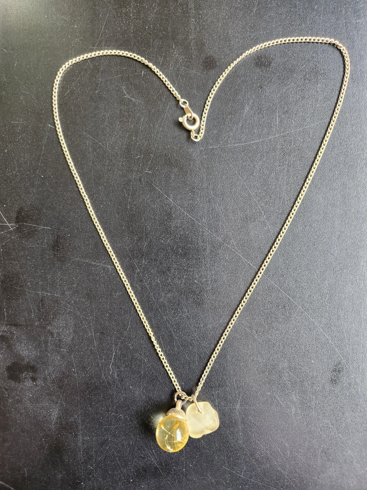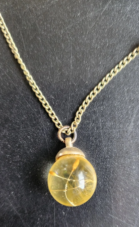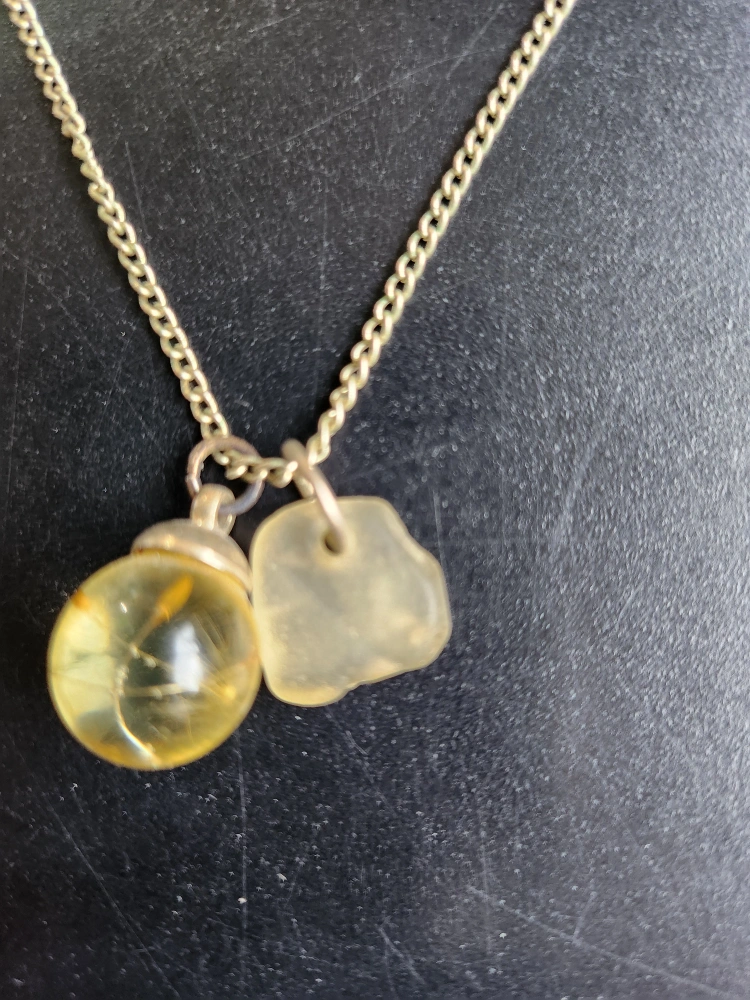 26Beautiful necklace features a gold chain and two charms. One charm is a clear sphere with a small scottish plant inside. The other is an irregular shaped piece Scottish rock. Unique and delicate.