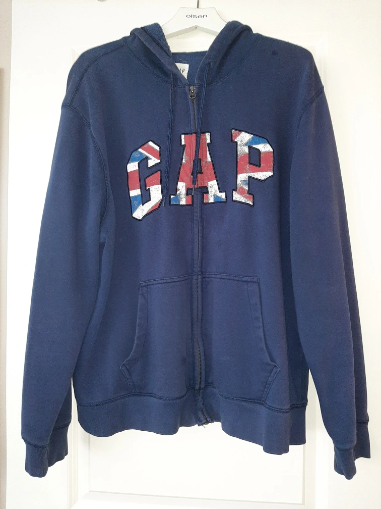 Navy blue zip-up hoodie. Features a large GAP logo on the front. Long sleeves, kangaroo pocket. Great for casual wear.
