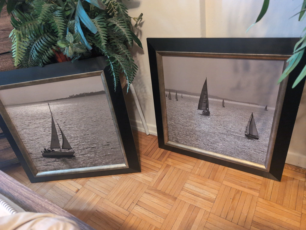 Two framed sepia-toned sailboat prints. Black frames with a gold inner border. Pictures are of sailboats on the water.