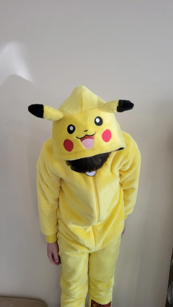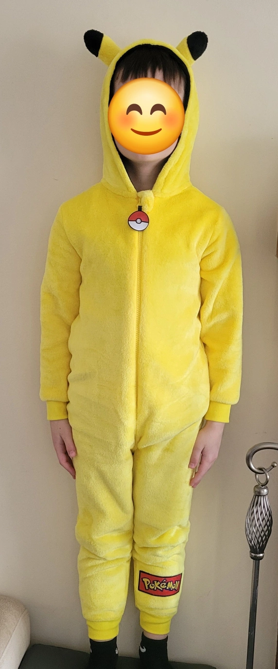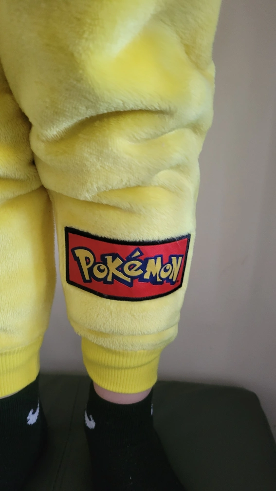 Adorable Pikachu onesie. Yellow fleece material. Features a hood, zipper closure, and Pokémon branding. Great for lounging or playtime.