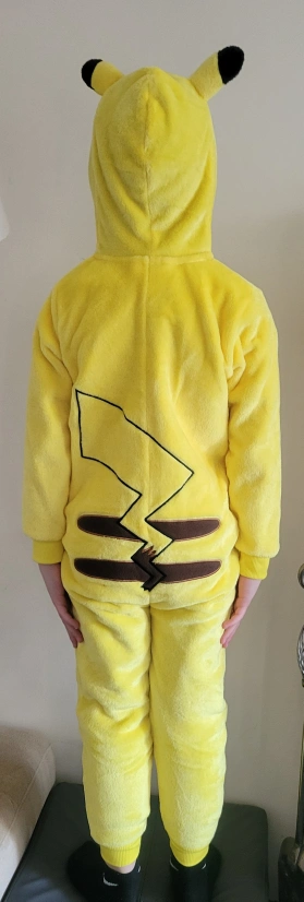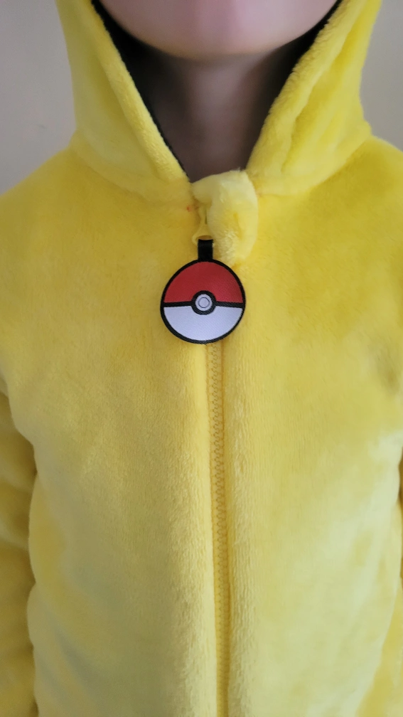 Adorable Pikachu onesie. Yellow fleece material. Features a hood, zipper closure, and Pokémon branding. Great for lounging or playtime.