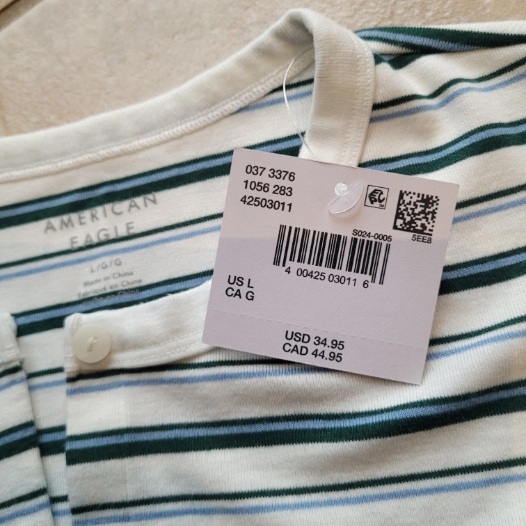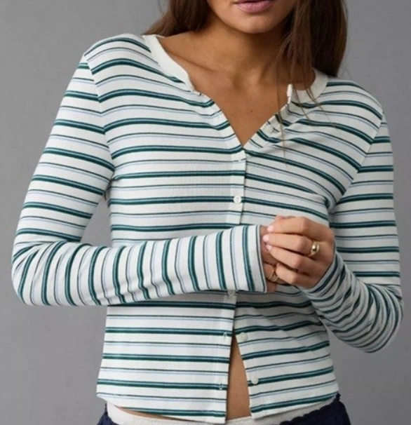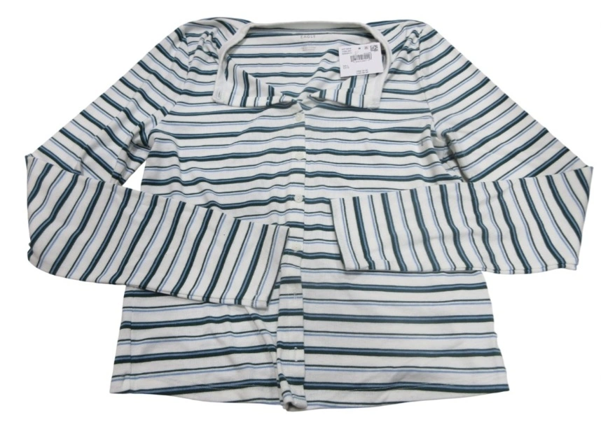 Women's long-sleeve cardigan. White, teal and navy blue stripes. Button-front closure. Size Large. New with tags.