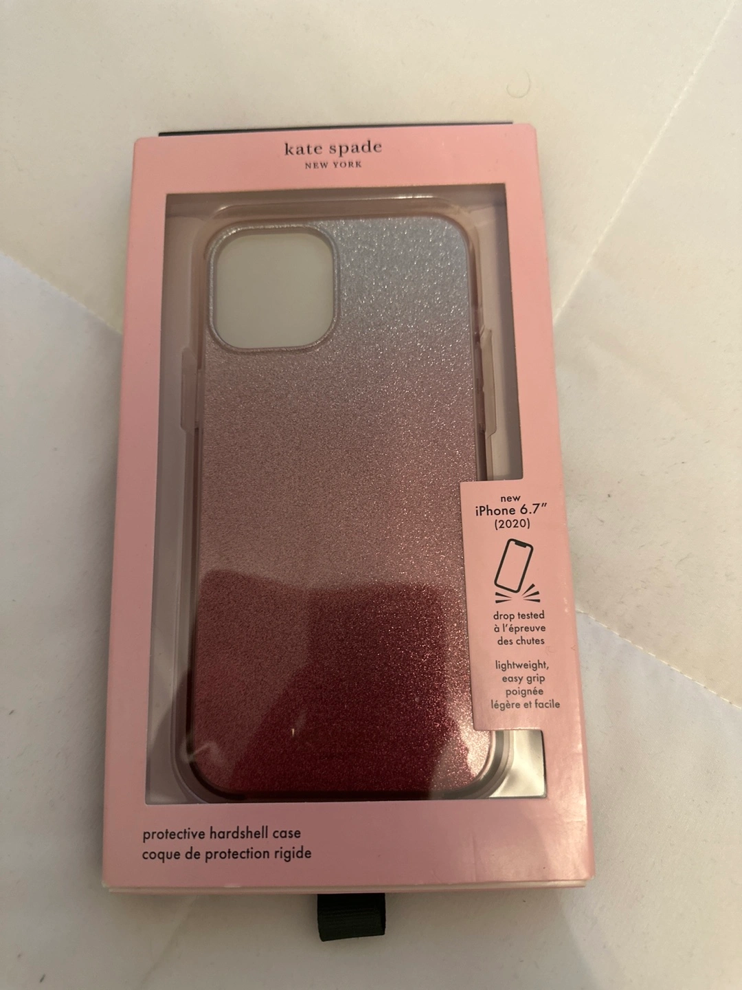 New Kate Spade phone case. Protective hardshell case. Drop tested. Lightweight and easy grip. Glitter ombre design. Compatible with iPhone 6.7" (2020).