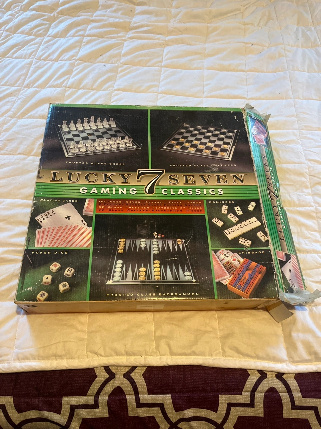 Vintage boxed game set. Includes frosted glass chess, checkers, backgammon, dominoes, cribbage, poker dice and playing cards. Seven classic table games.