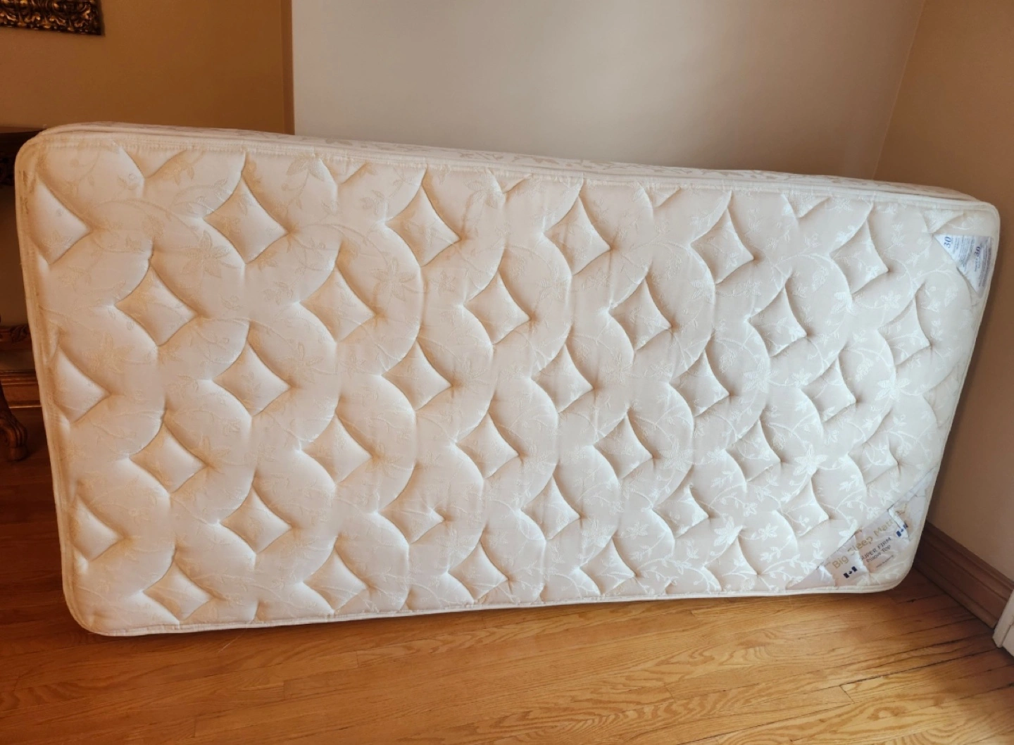 Twin pillow top firm mattress. Was in a spare bedroom. This mattress is from a smoke free pet free immaculately clean home.