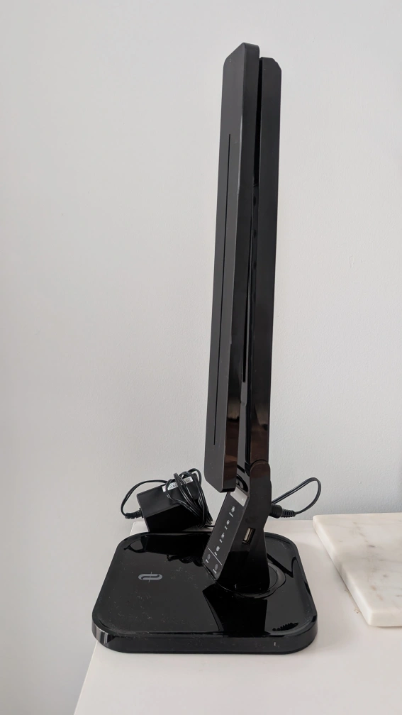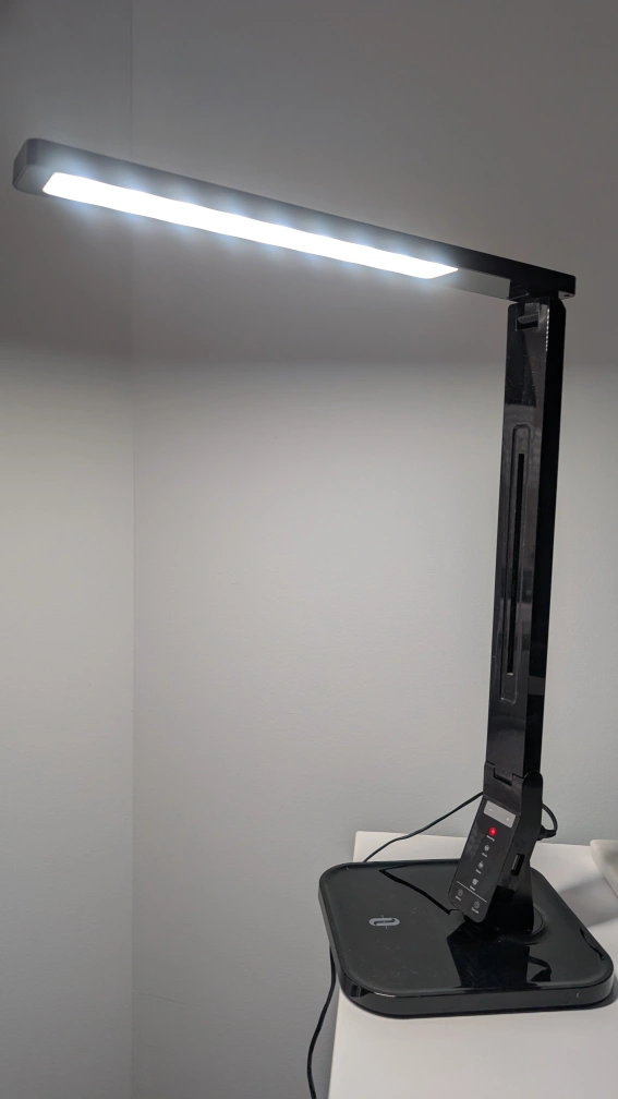 TaoTronics TT-DL01 Dimmable black desk lamp. Features a long LED light bar, adjustable arm, and USB charging port. Includes multiple light modes and a timer. Power adapter included.