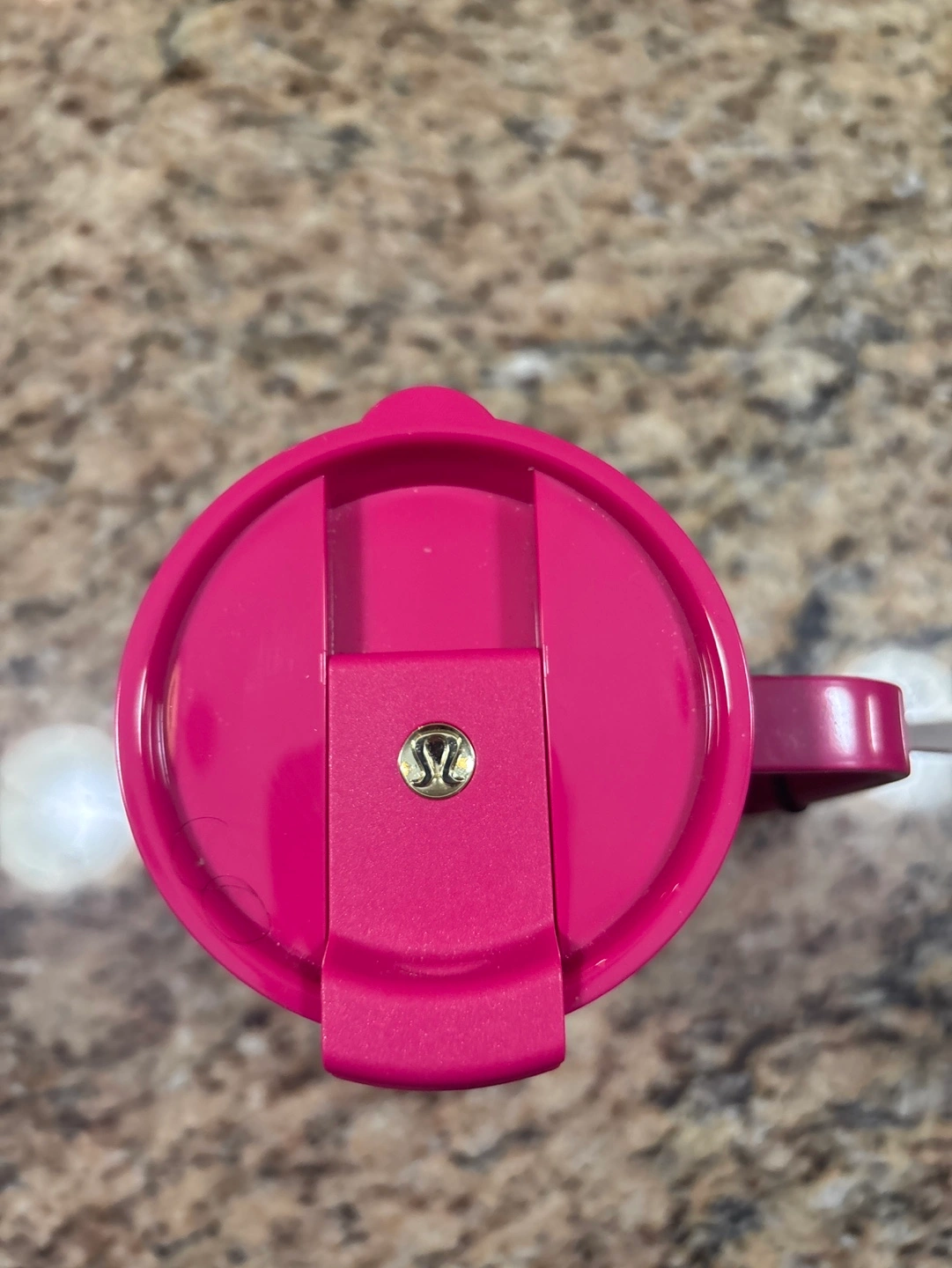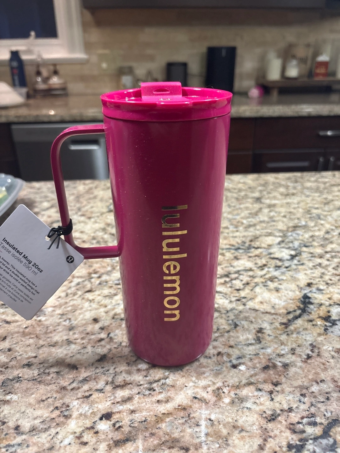 Pink Lululemon insulated mug. 20oz capacity. Features a handle and a secure lid. Keeps your drinks hot or cold.