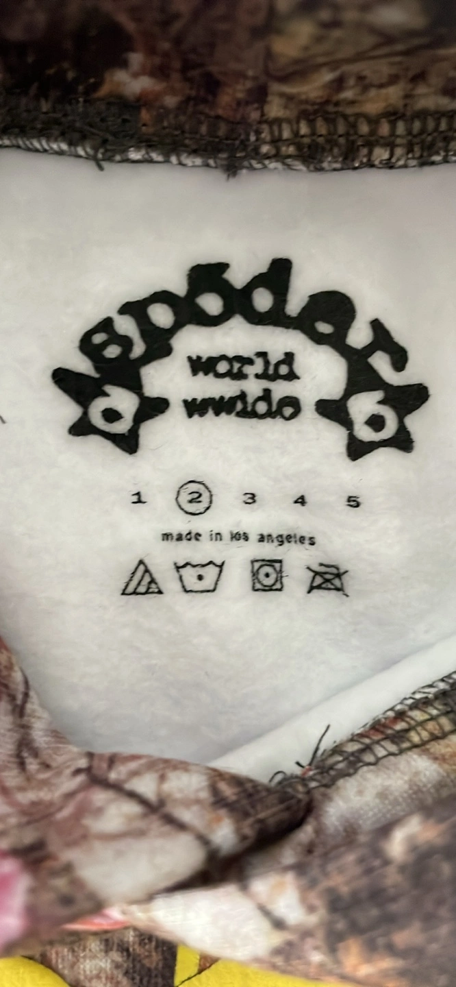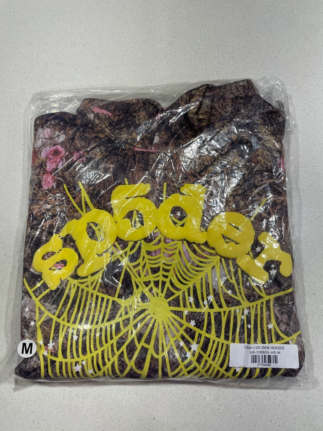 Men's size medium hoodie. Camo print. Yellow spiderweb design. New with tags.