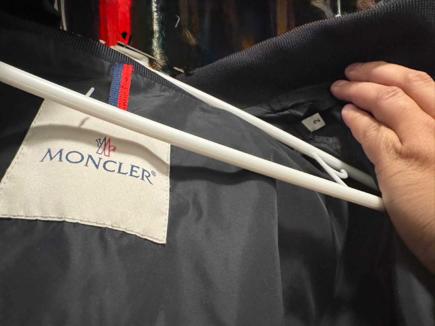 Black hooded jacket. Features a zipper closure, two front pockets, and ribbed detailing at the cuffs and hood. Size 2.