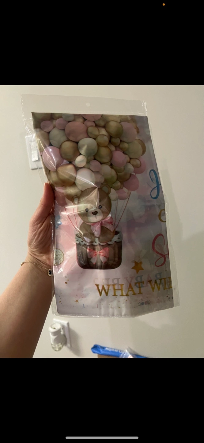 Unused gender reveal party supplies. Includes banner, plates, napkins, and cutlery. Adorable teddy bear hot air balloon theme. Pink and blue colour scheme.