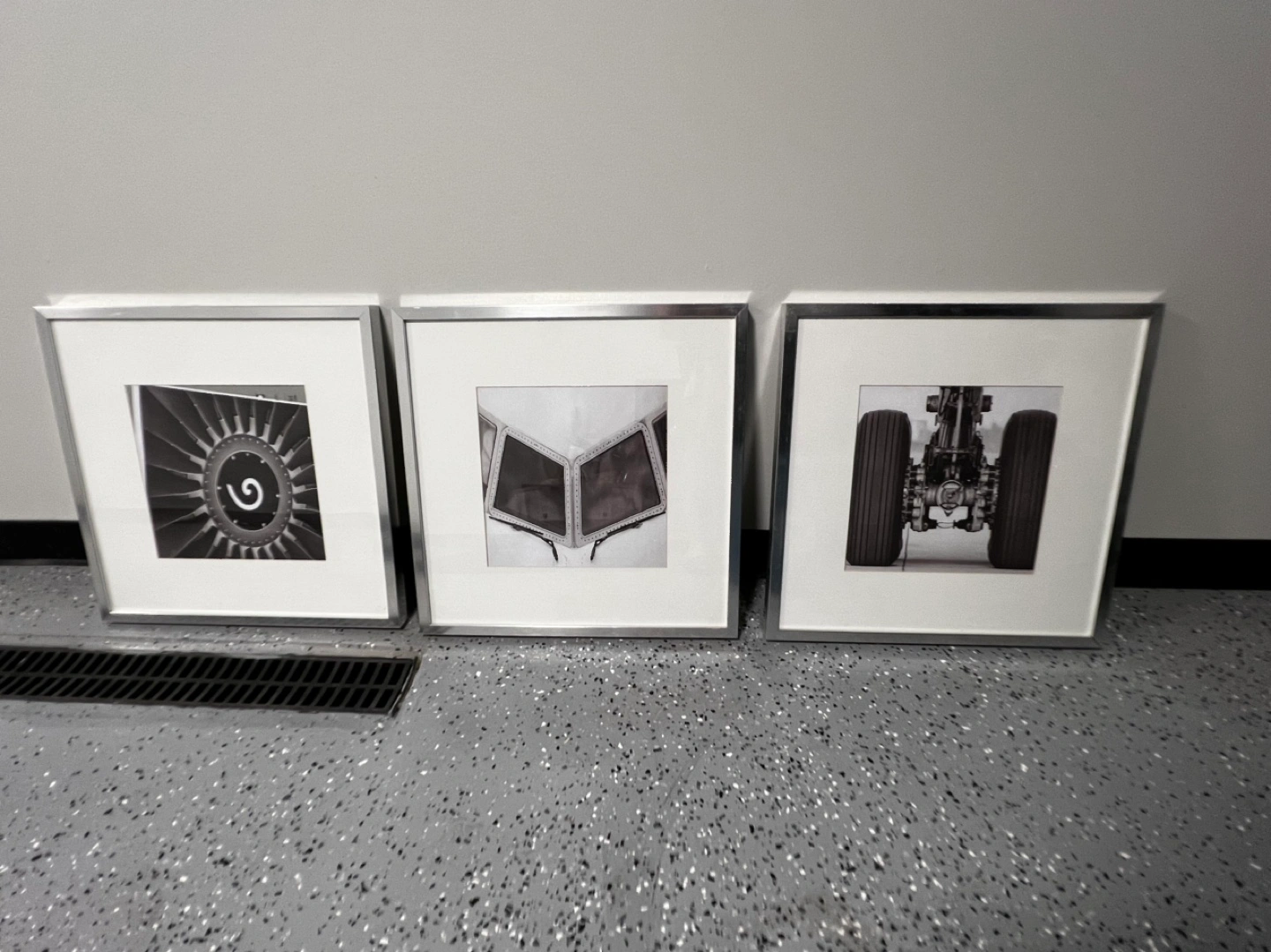 Three framed monochrome prints. Feature airplane engine, cockpit, and landing gear. Silver frames. Modern style. Perfect for aviation enthusiasts.