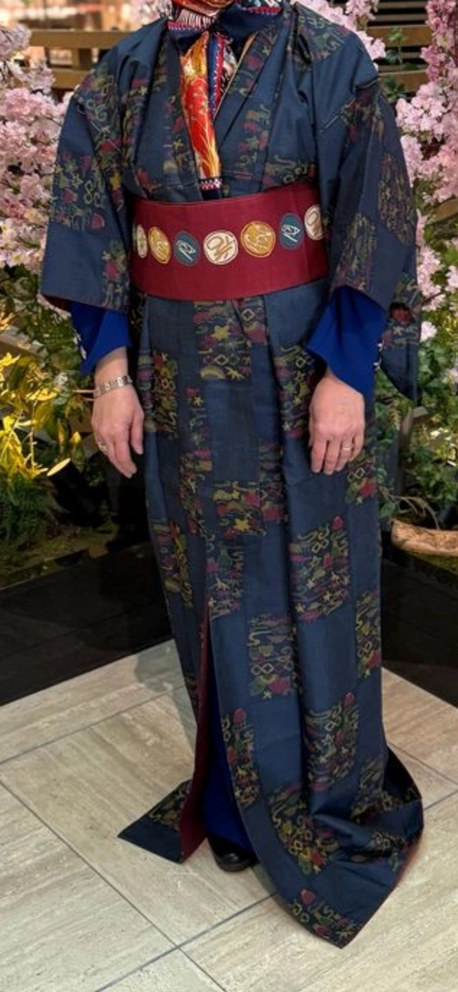 Beautiful navy blue kimono, intricate pattern, red obi with gold accents. Long sleeves, floor-length. Suitable for special occasions or collectors.