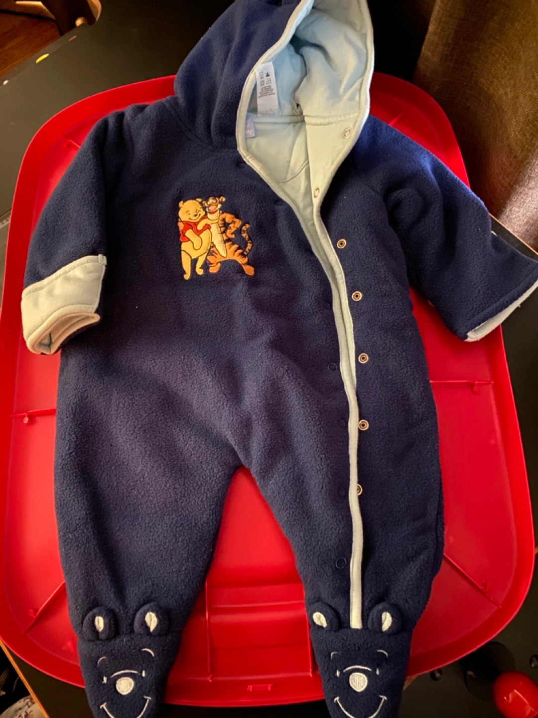 Adorable baby Winnie the Pooh fleece jumpsuit. Features a hooded design, and cute embroidered Pooh and Tigger. Excellent for keeping your little one warm and cozy.