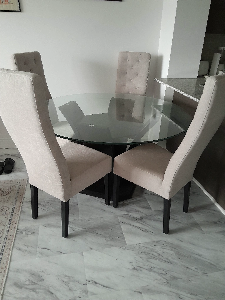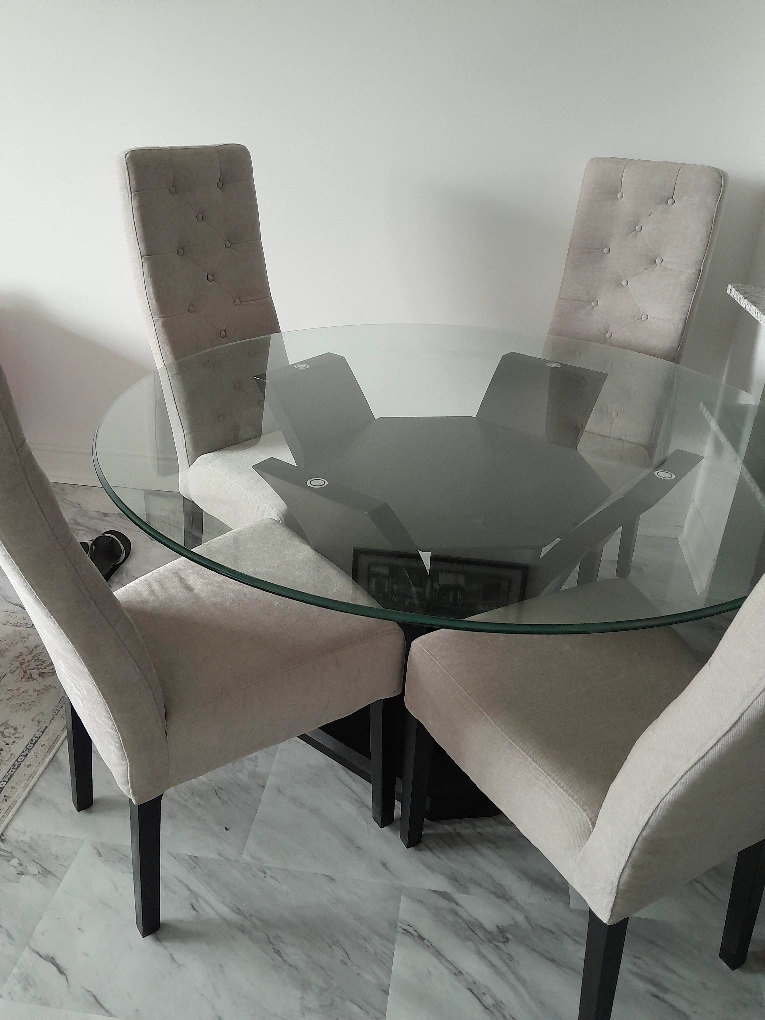 A glass dining table with 4 stylish chairs for sell or the best offer . It is your last chance!
