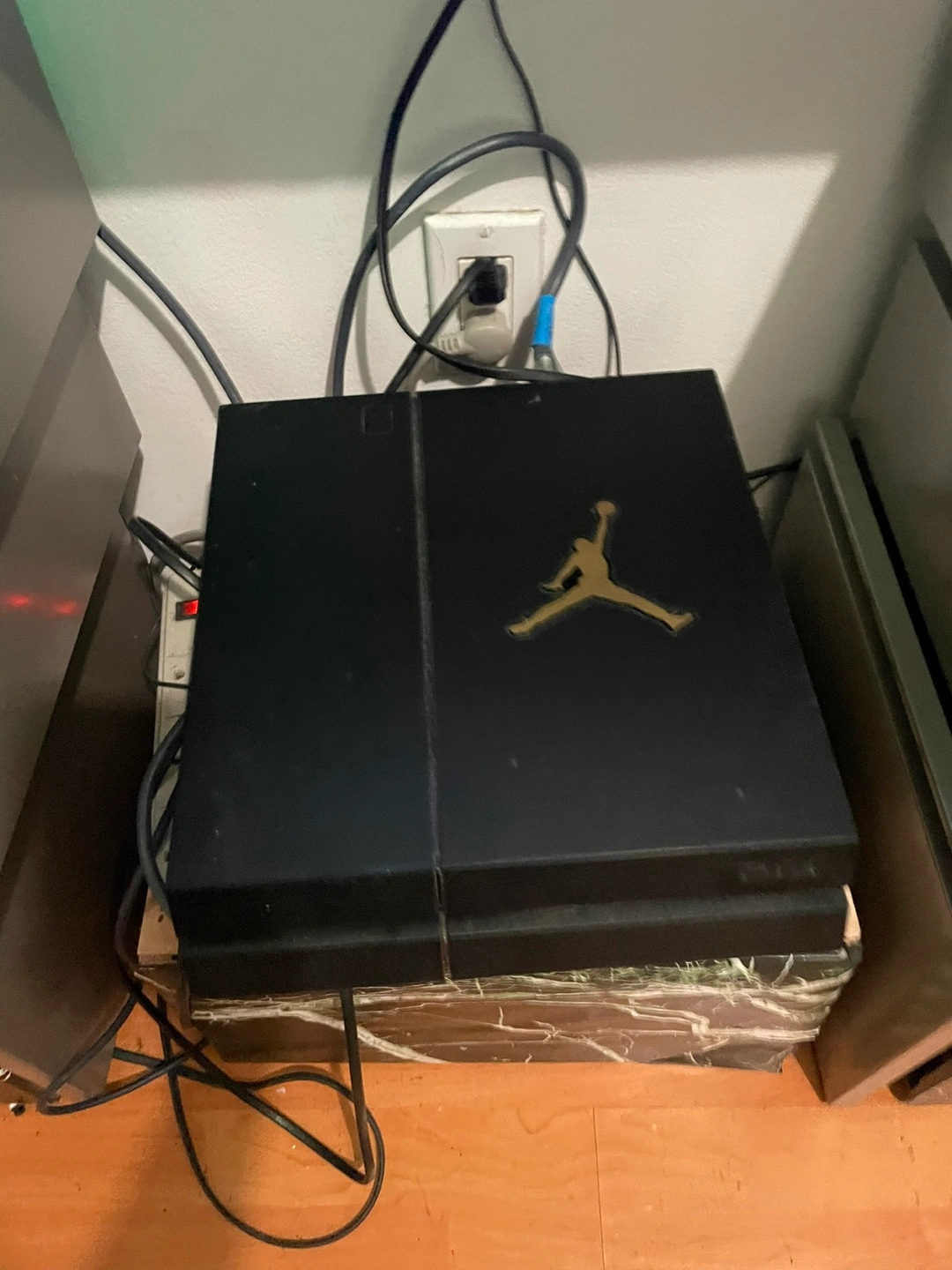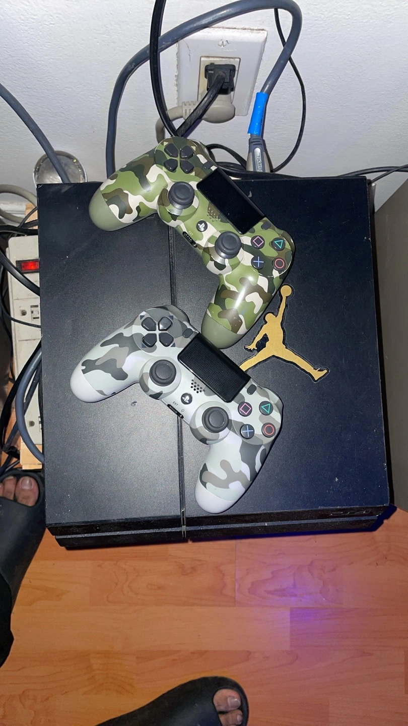 PlayStation 4 console. Custom Jordan-branded faceplate. Two camouflage DualShock 2 controllers included. Eight PlayStation 4 games: Assassin's Creed Syndicate, Batman: Return to Arkham, Call of Duty WWII, Uncharted 4, Call of Duty: Black Ops III, Need for Speed, and two others. Minor wear and tear expected.