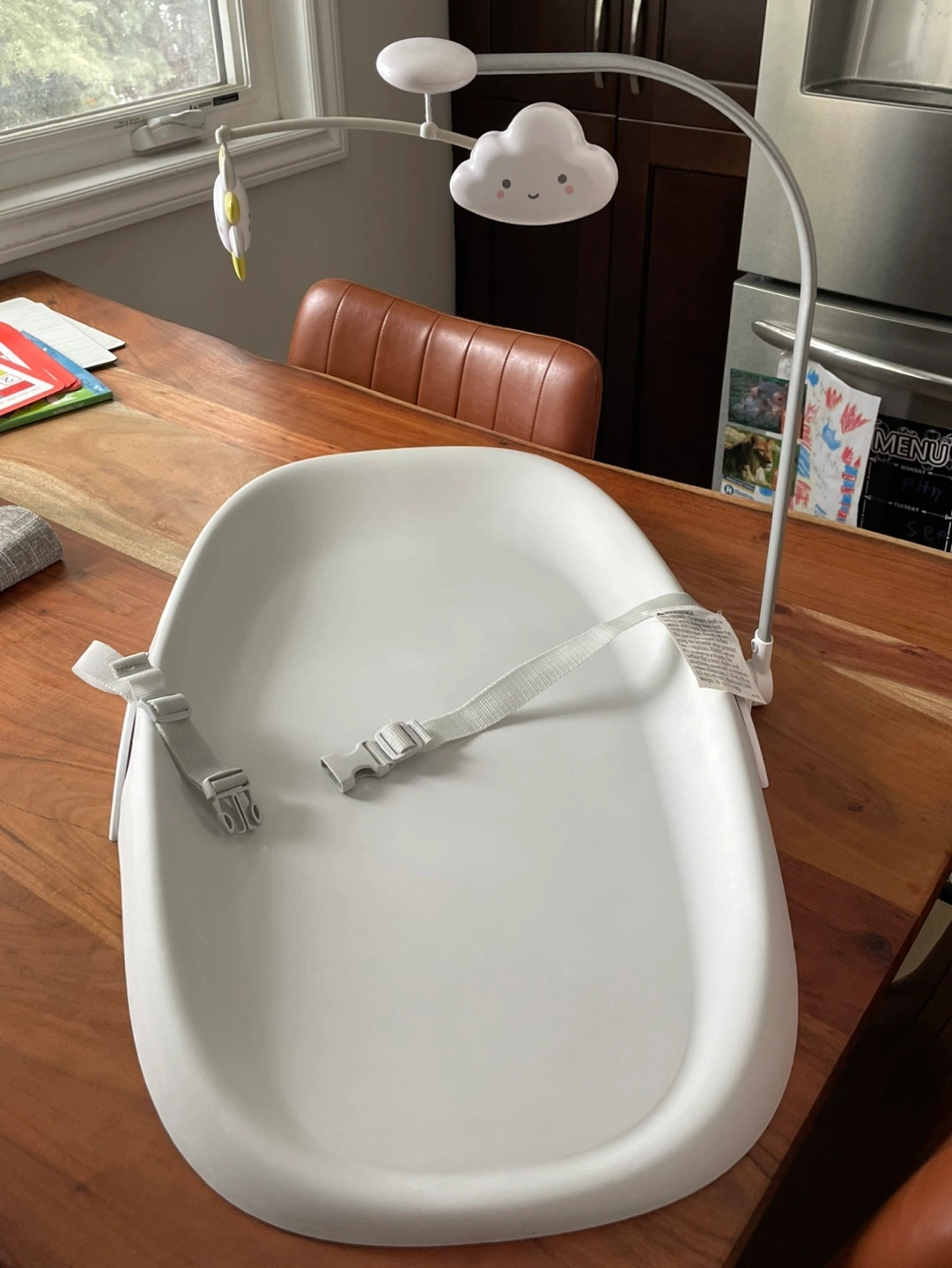 Great addition to your changing table. Is wipe clean; although we only ever used with a cover. Baby loved the mobile. Soft and comfy with safety strap. Excellent used condition. Retails for $115.
