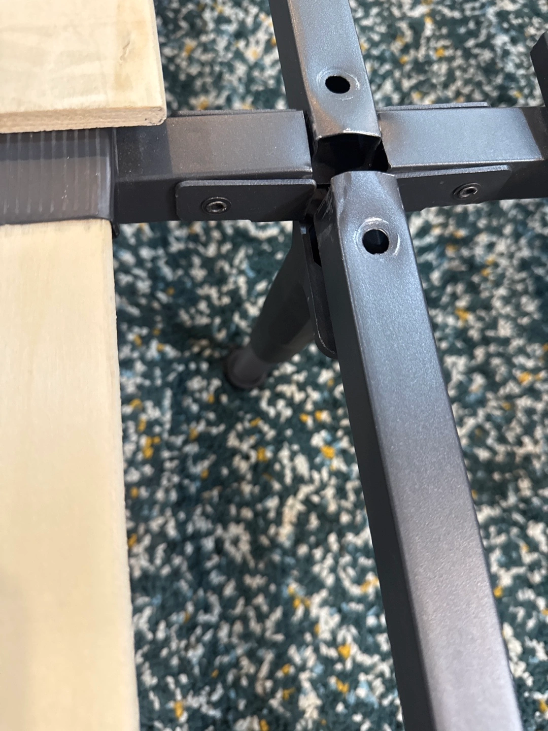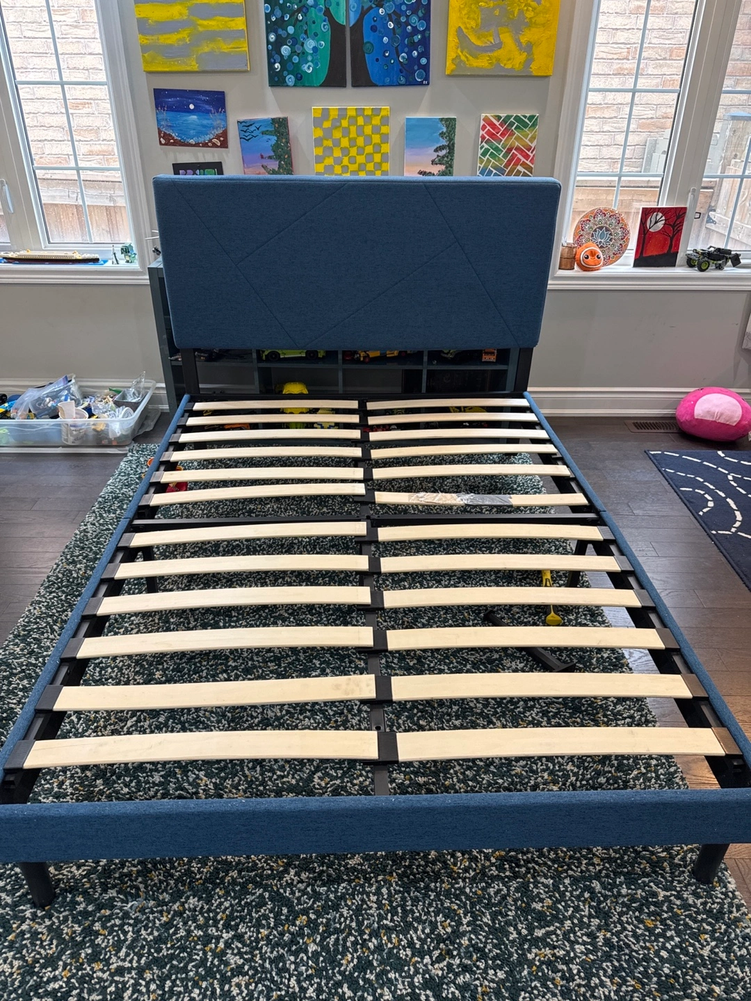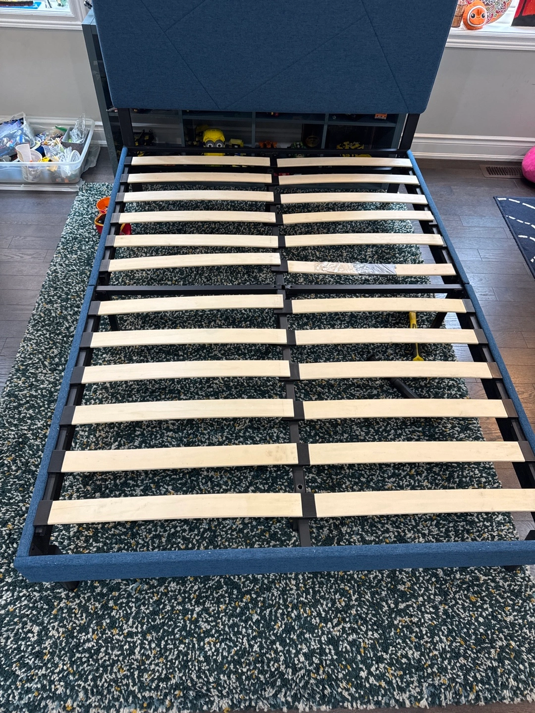 Double bed frame, blue fabric headboard, slatted base. Minimal assembly required. Some minor wear and tear. I have included some legs support that can be screwed and if not moved a lot it’s quiet a good bed. Removing it as my son wants a new theme for his room.