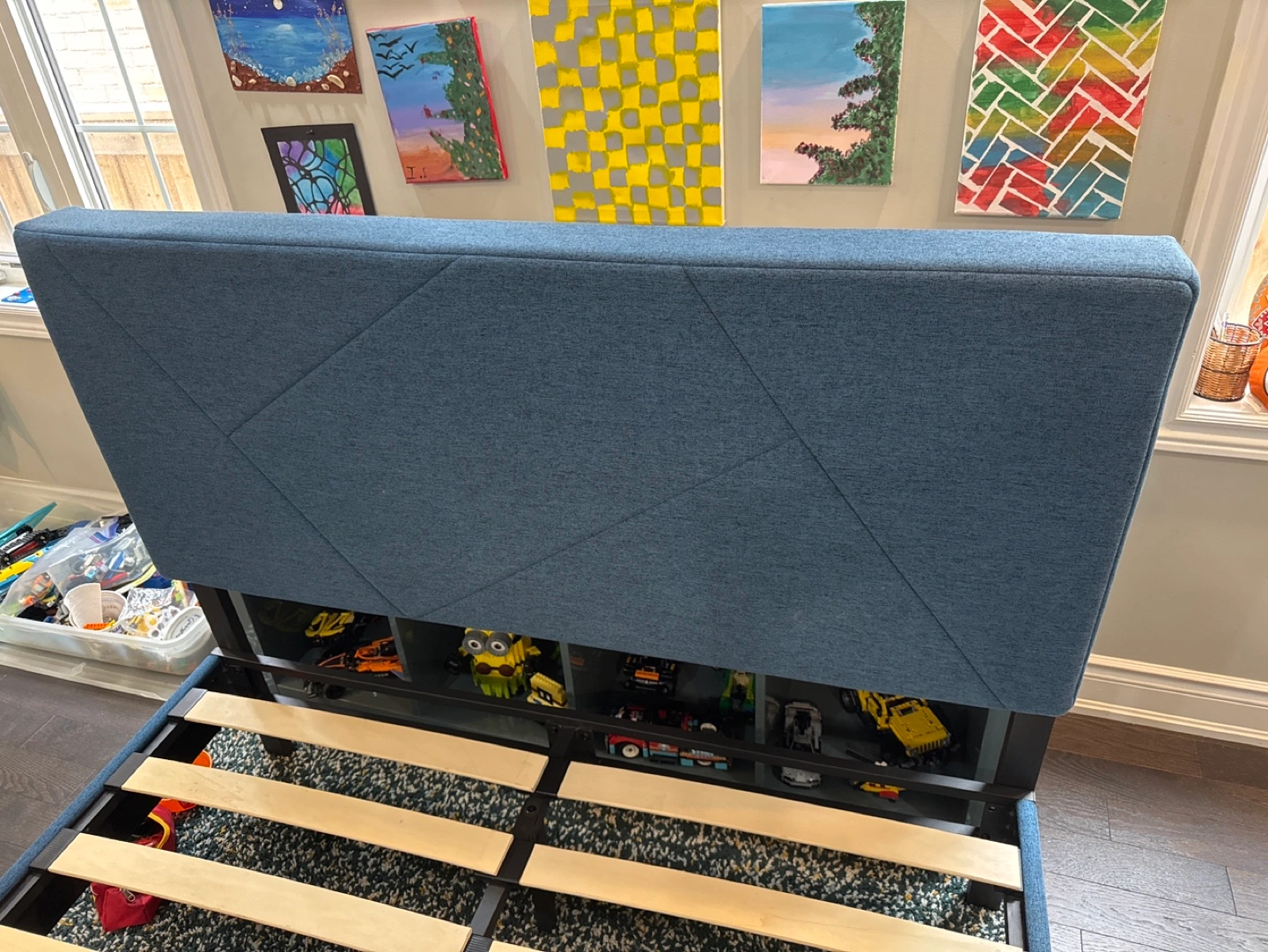 Double bed frame, blue fabric headboard, slatted base. Minimal assembly required. Some minor wear and tear. I have included some legs support that can be screwed and if not moved a lot it’s quiet a good bed. Removing it as my son wants a new theme for his room.