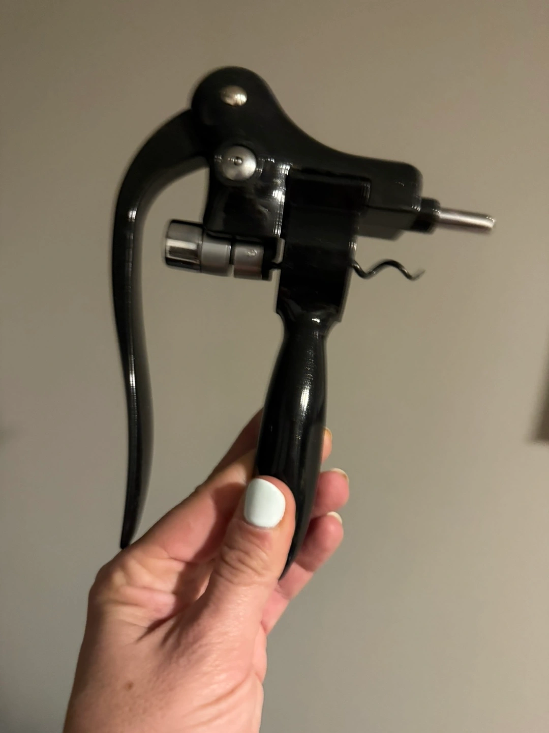 Black lever-action wine opener. Features a comfortable grip and smooth operation. Perfect for effortless wine uncorking.
