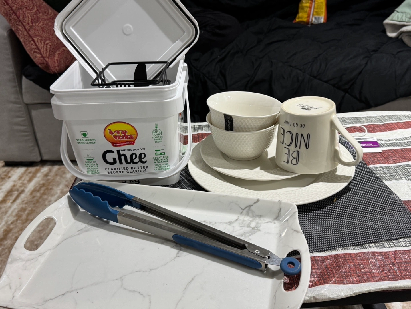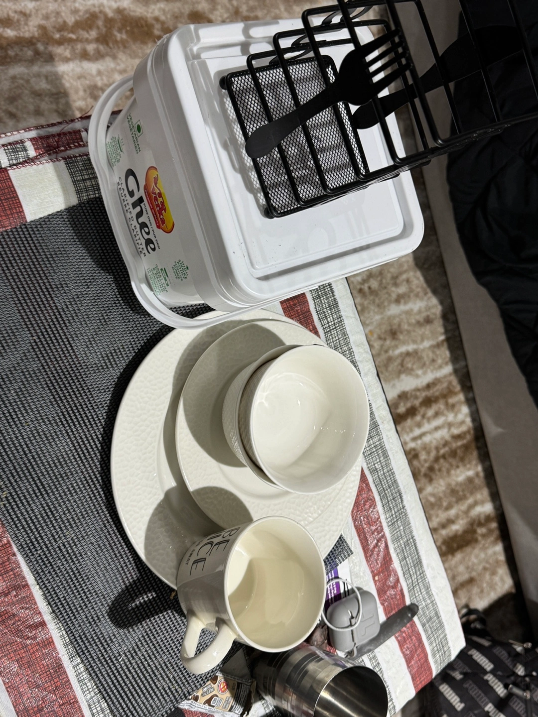White ceramic dinnerware set. Includes plates, bowls, and mugs. Also features a black metal utensil holder and serving tray. Blue handled tongs included.