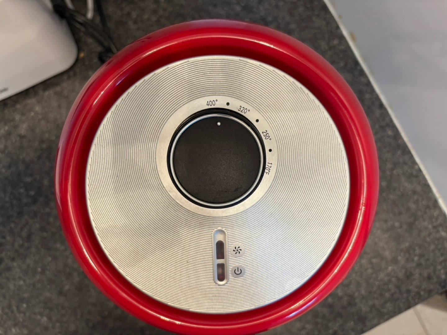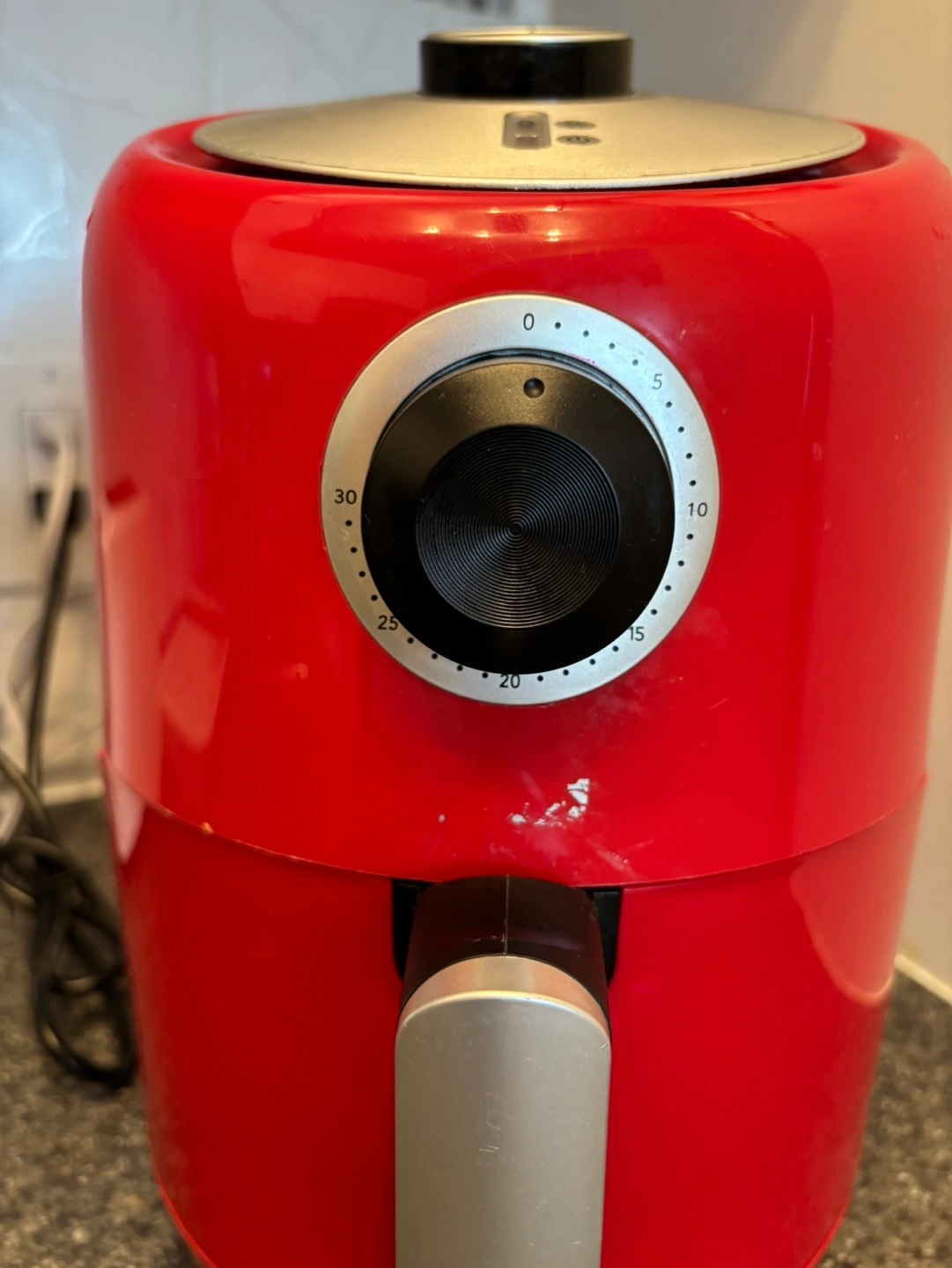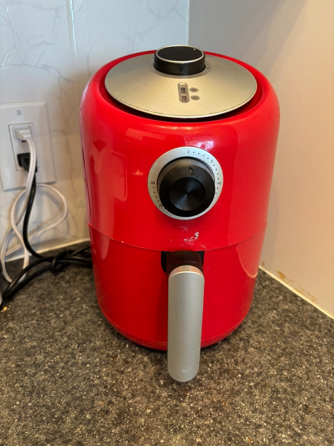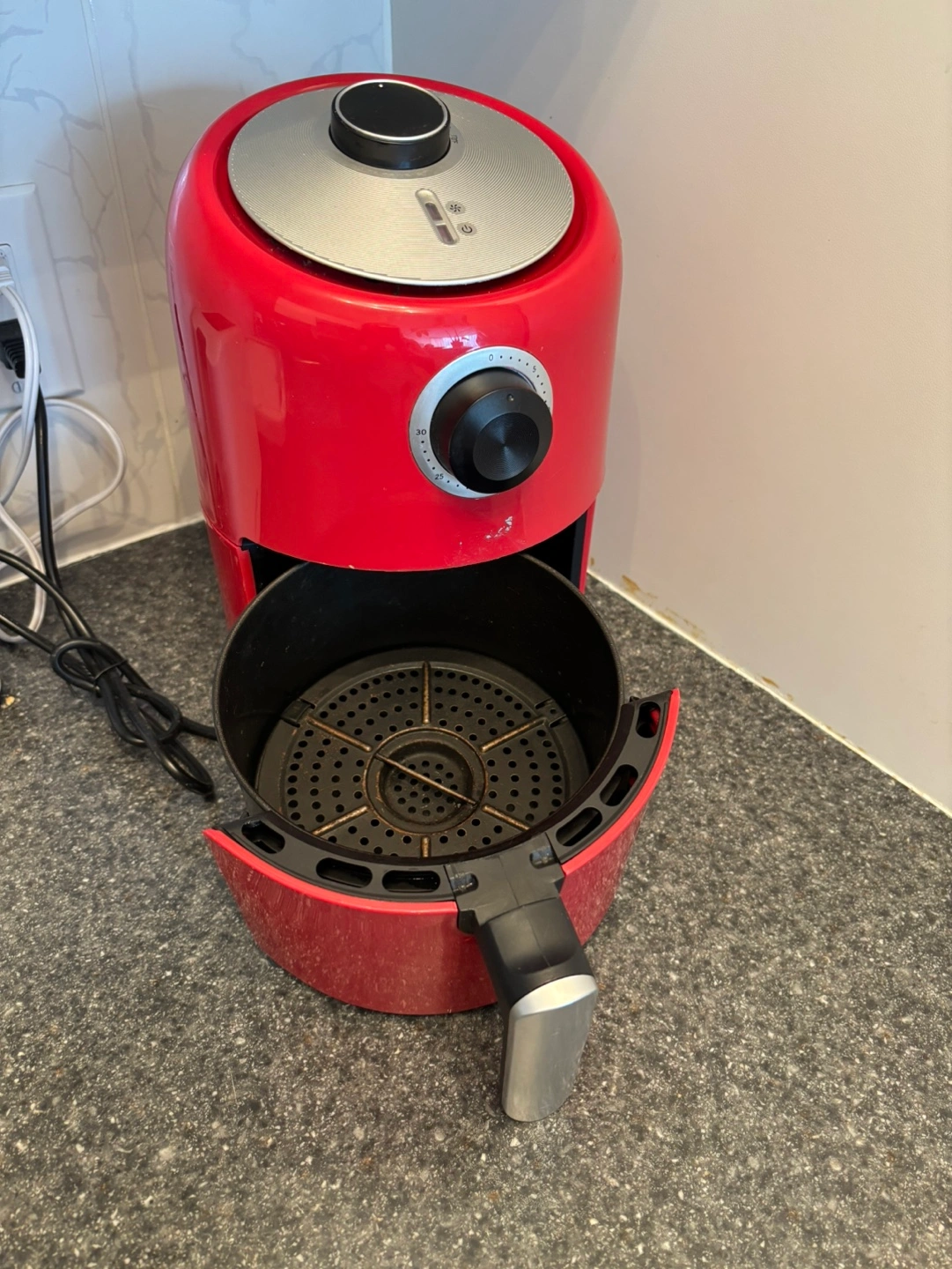 Compact red air fryer. Features a 30-minute timer and adjustable temperature control. Includes a removable basket. Good for small kitchens. It works perfectly!