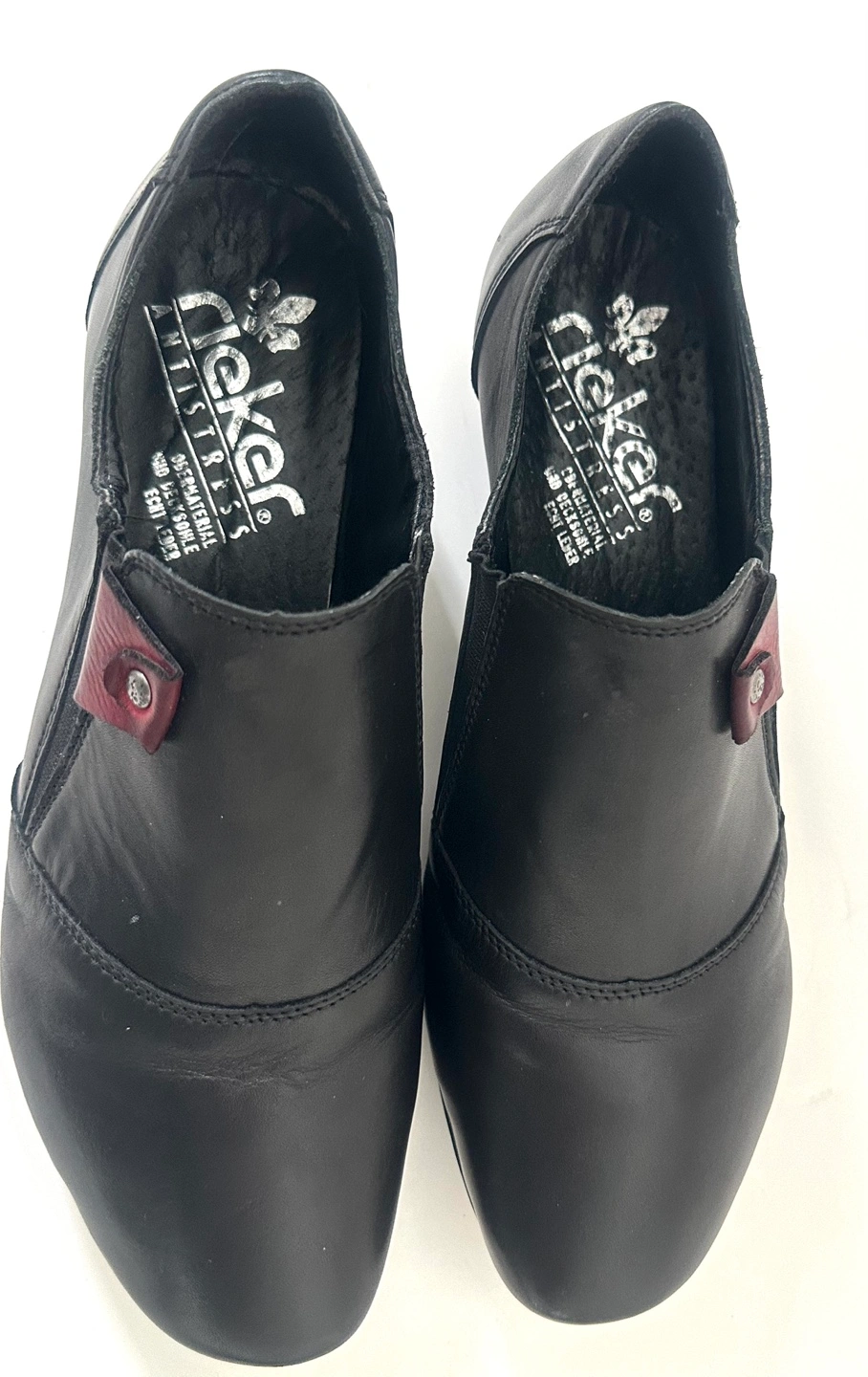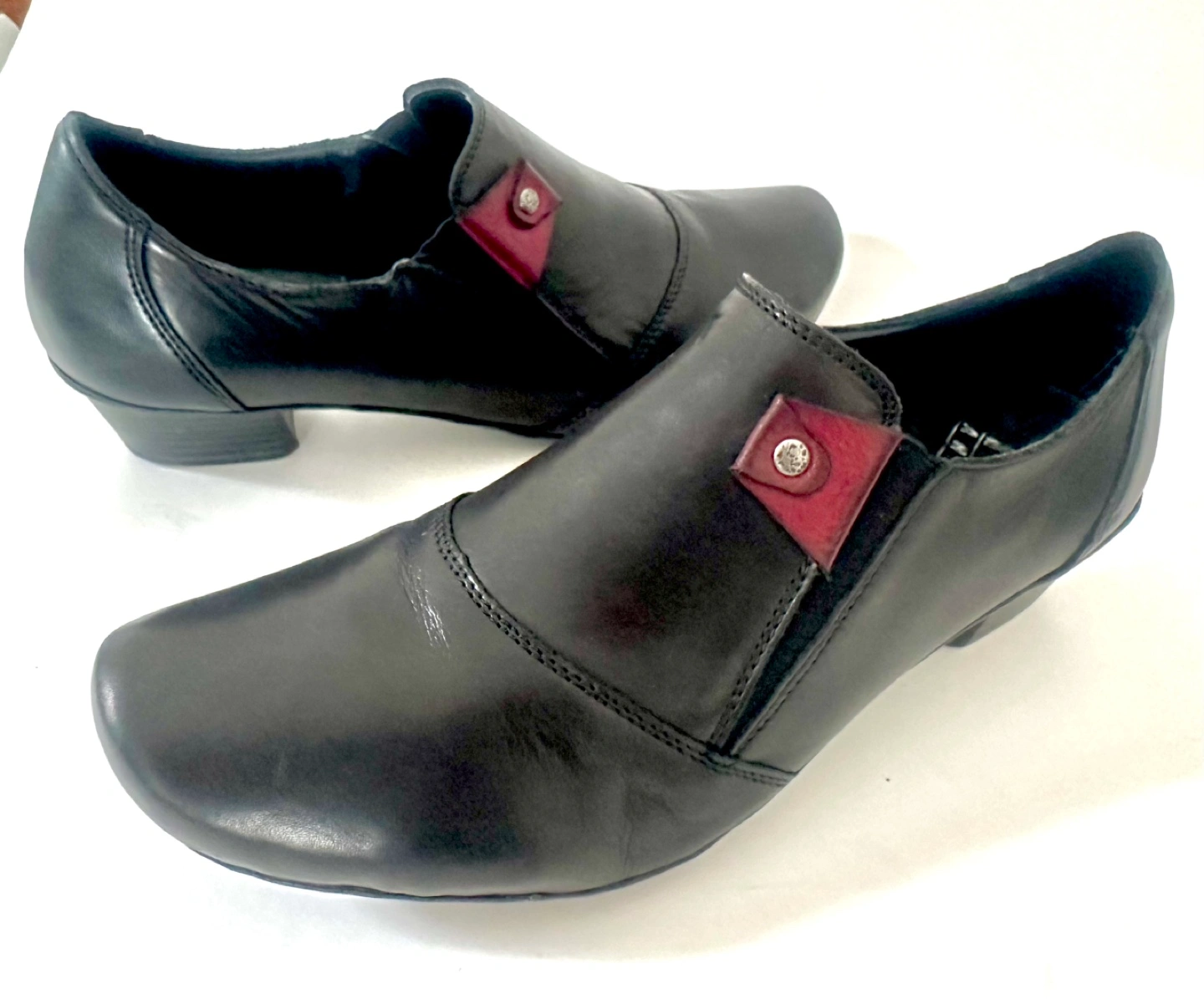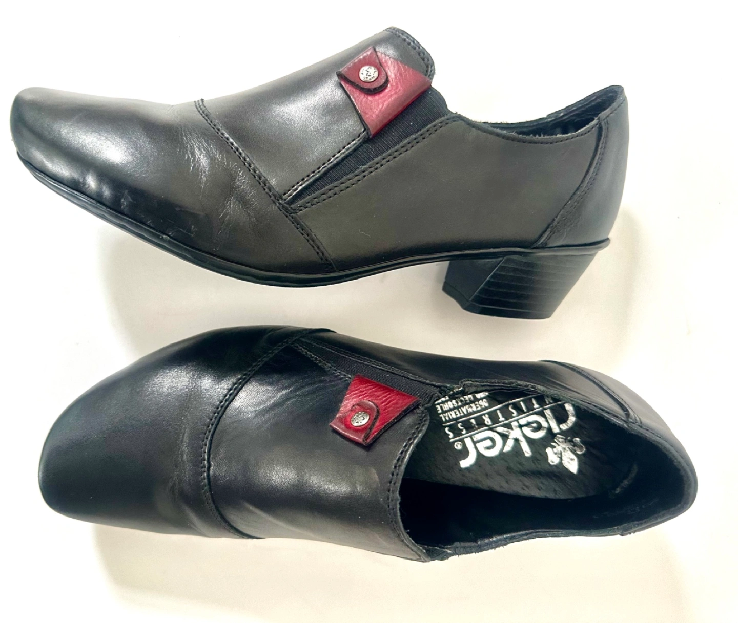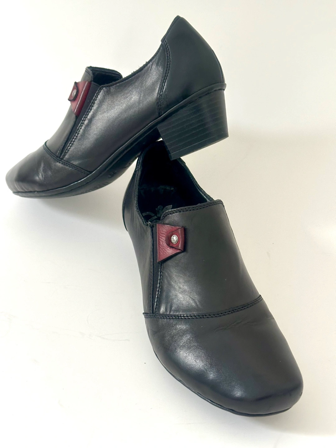 65Like New! Worn once … RIEKER European comfort Size 7 / EU 38 Black leather slip-on shoes. Low block heel. Small burgundy accent. Comfortable and stylish. From a smoke free pet free home. Pick up an Alta Vista.