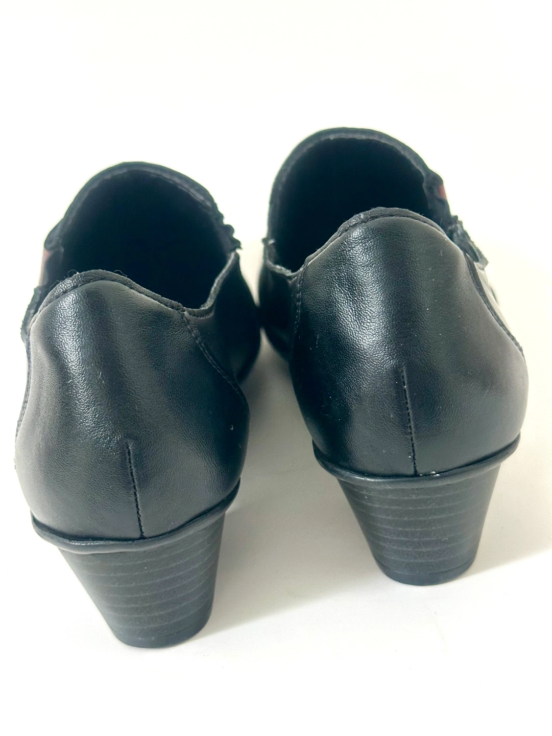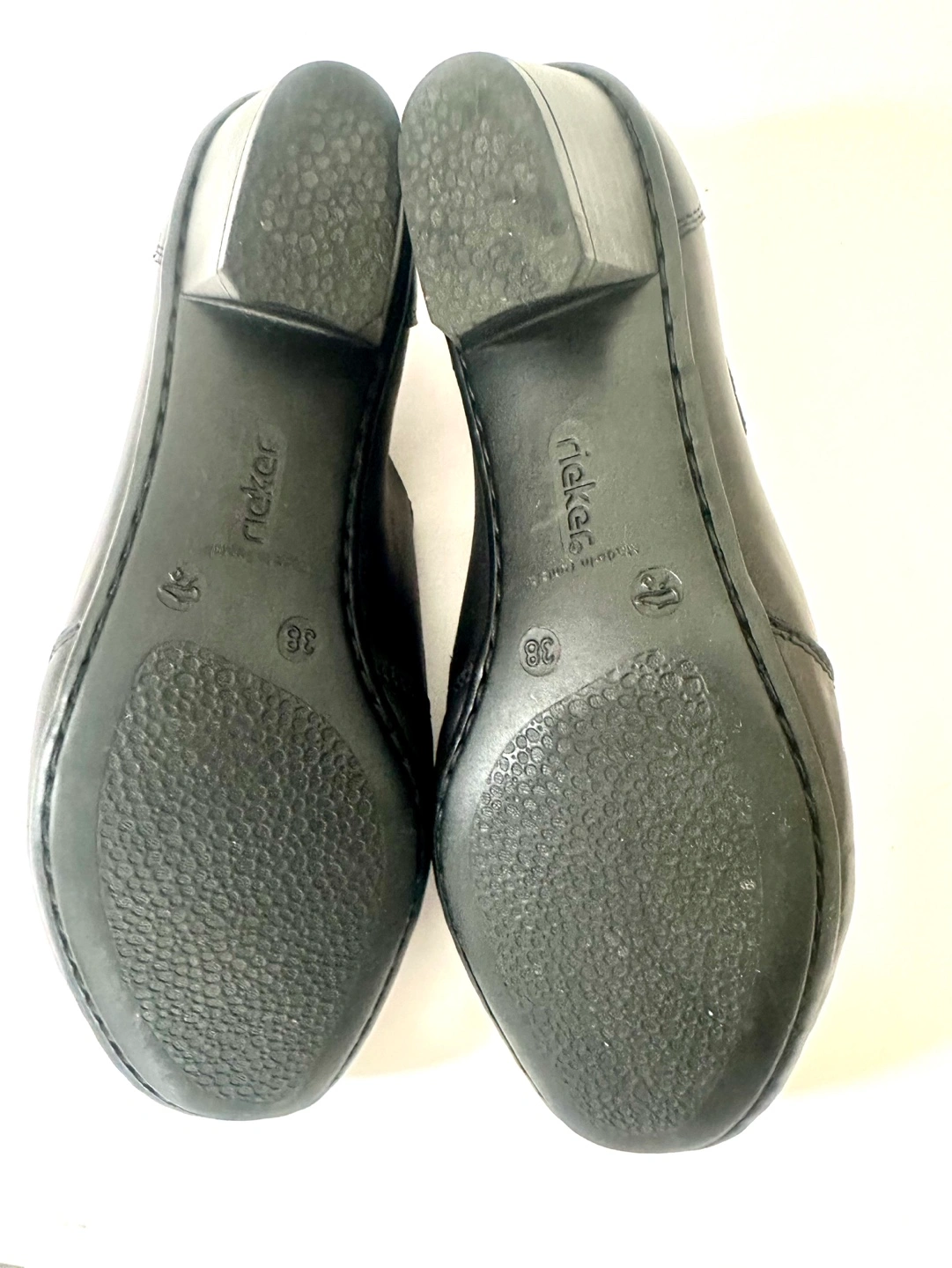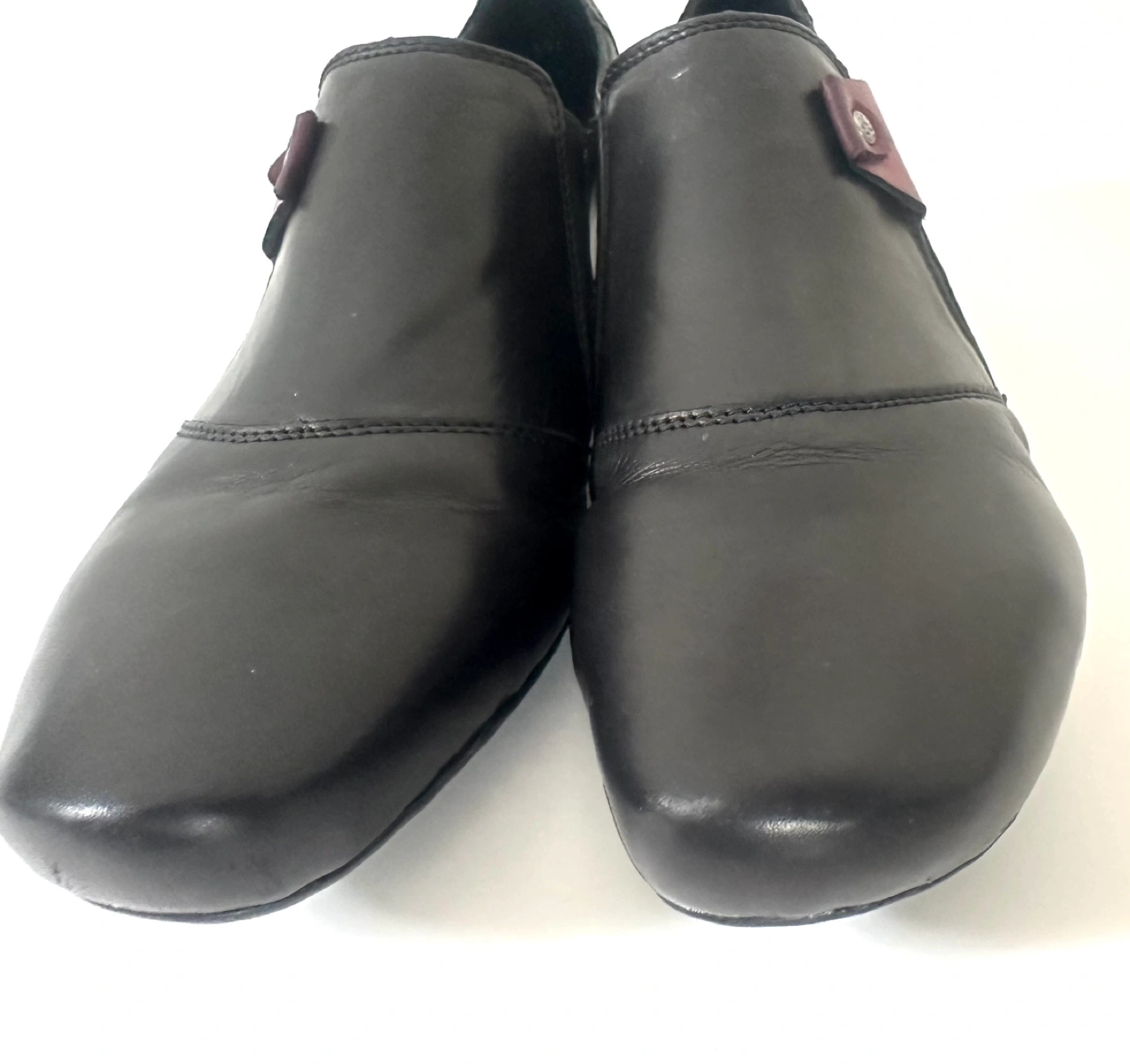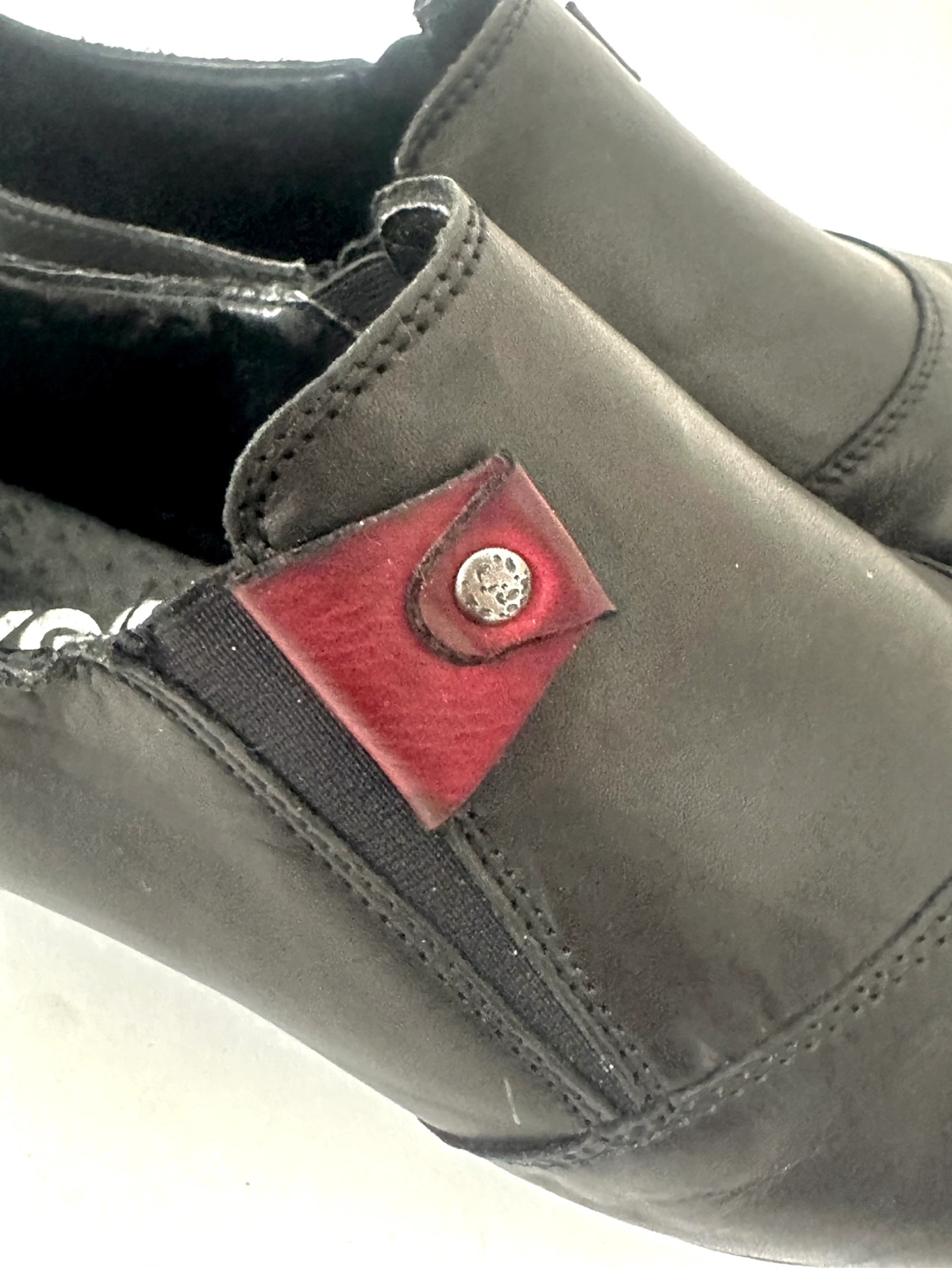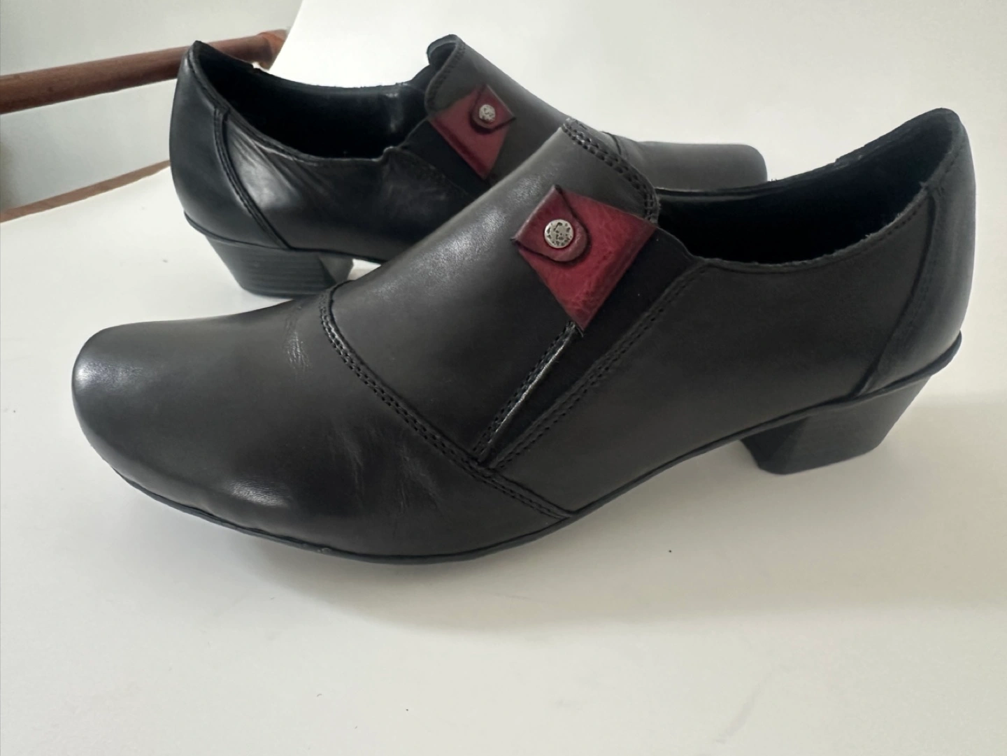 65Like New! Worn once … RIEKER European comfort Size 7 / EU 38 Black leather slip-on shoes. Low block heel. Small burgundy accent. Comfortable and stylish. From a smoke free pet free home. Pick up an Alta Vista.