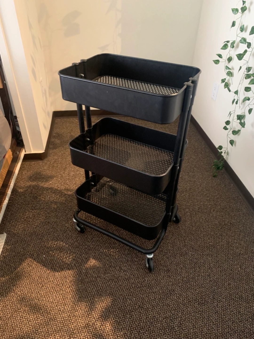 Metal, black. Had it for a few years, but works well. Three tiers/shelves - FYI I’m not able to unscrew the top shelf due to screwing it too tightly, I guess. My bad!
