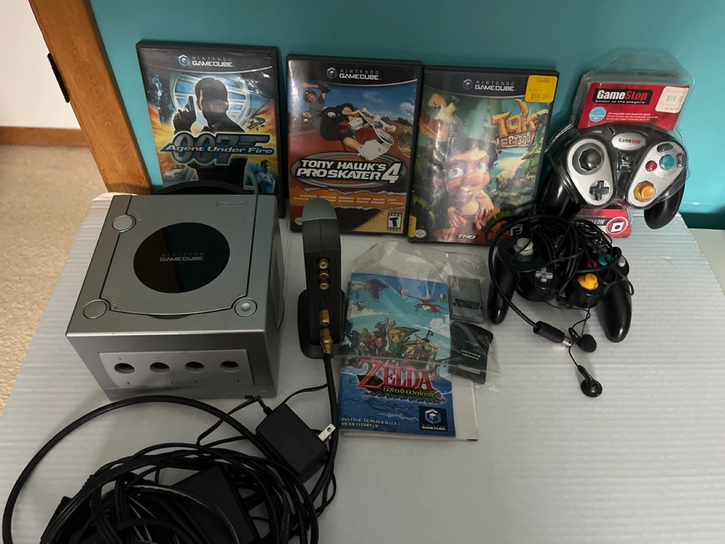 Nintendo GameCube with hook ups, two hand controllers and four games Zelda the wind wacker