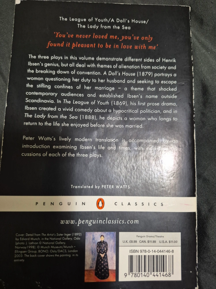 Penguin Classics edition. Includes three plays: A Doll's House, The League of Youth, and Lady from the Sea. Translated by Peter Watts. Paperback book.