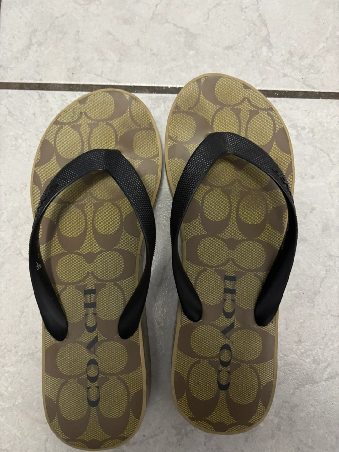 Pair of Coach platform flip flops. Beige and brown colour. Black straps. Worn but in good condition.