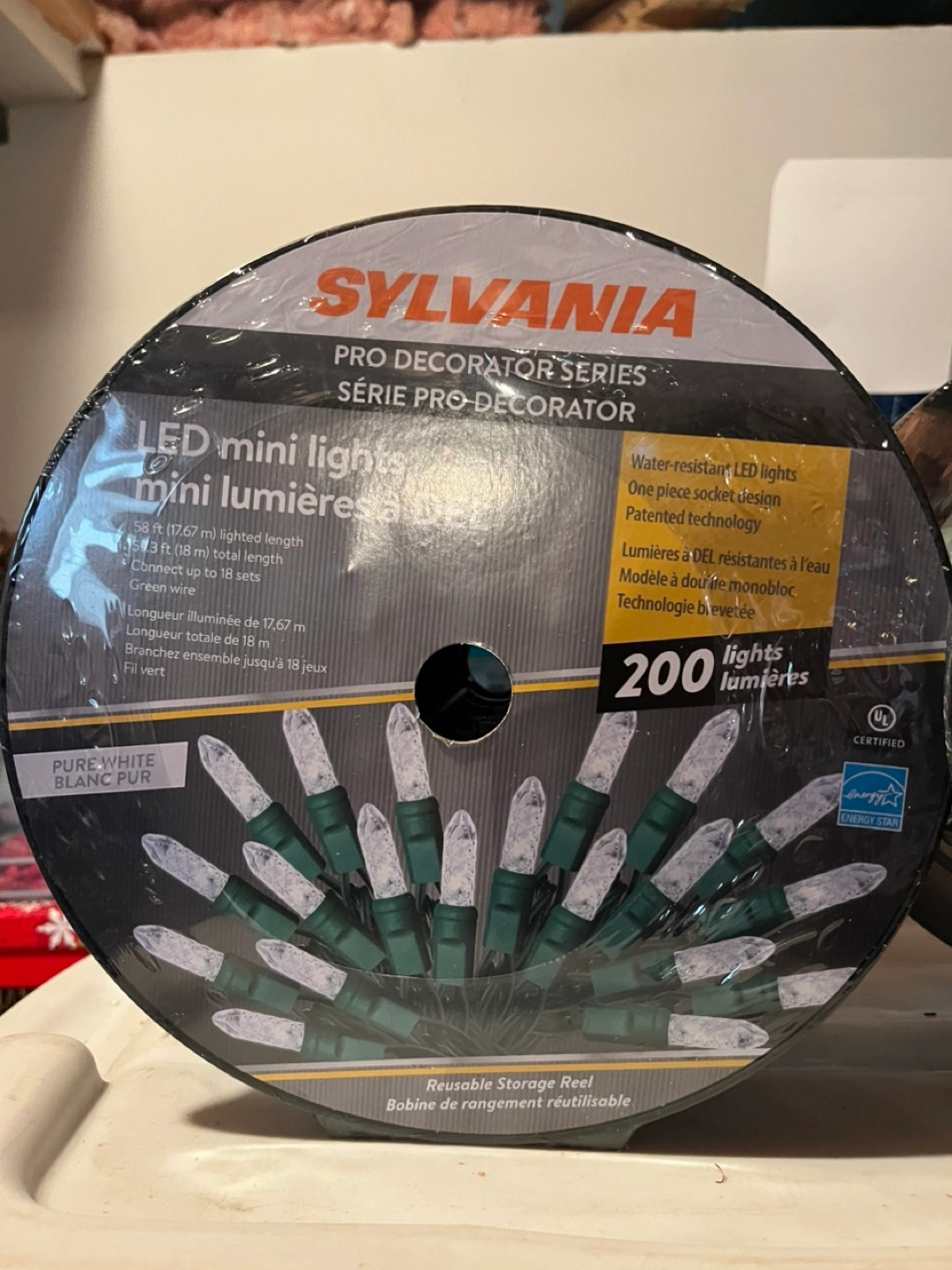 Two packs of Sylvania 200-count LED C6 Christmas string lights. Warm white. Indoor/outdoor use. Green wire. Water-resistant LED lights. Patented technology. Reusable storage reel. Rona $82.99 regular price. $100 for both.