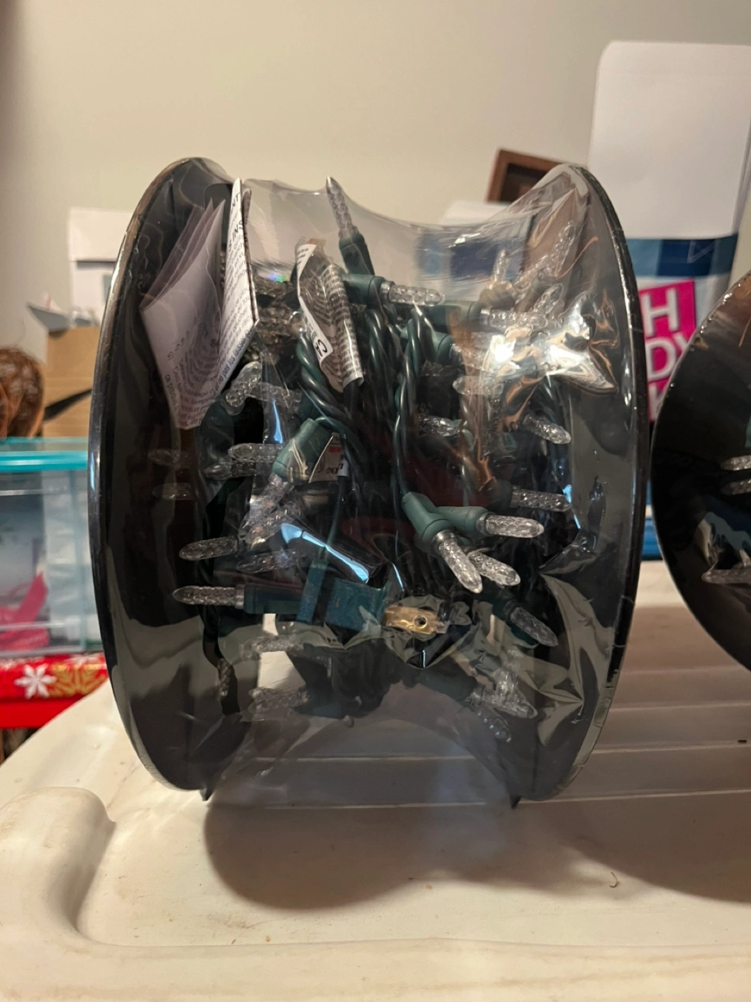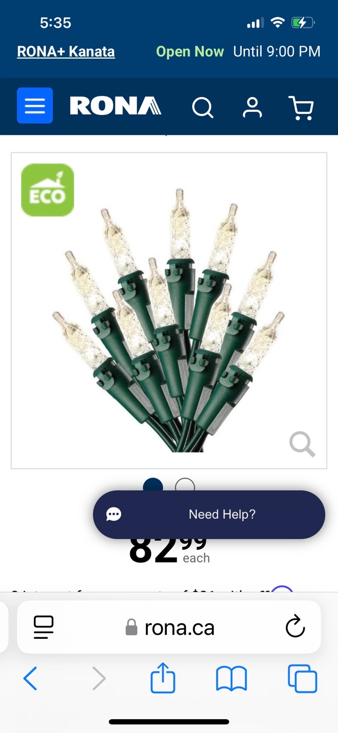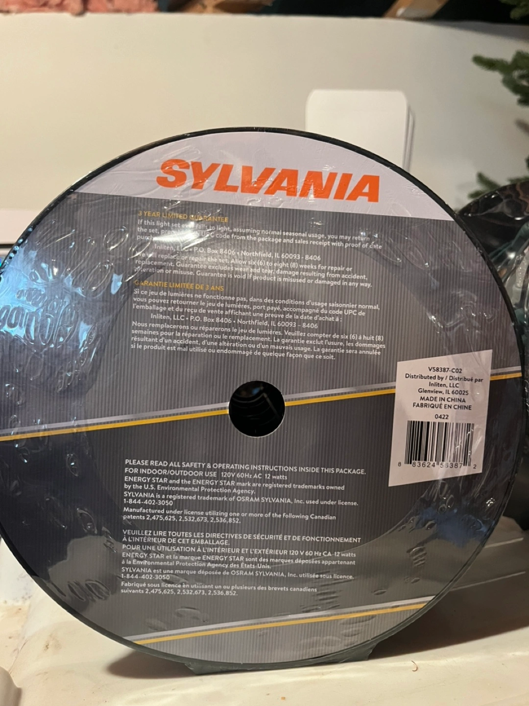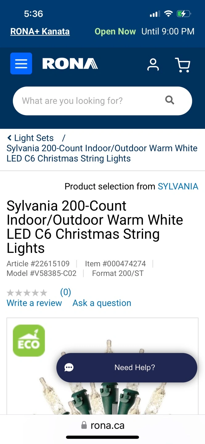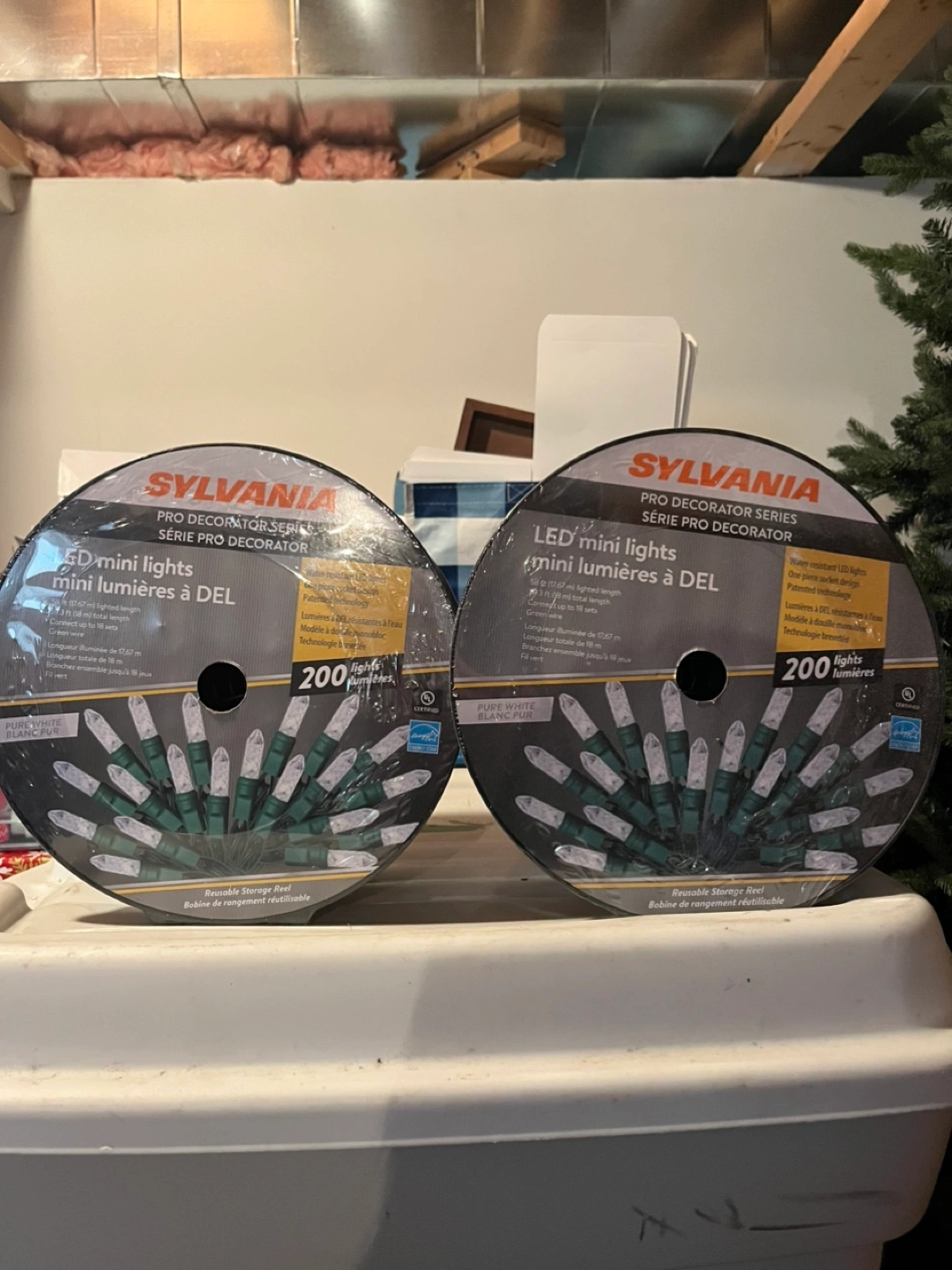 Two packs of Sylvania 200-count LED C6 Christmas string lights. Warm white. Indoor/outdoor use. Green wire. Water-resistant LED lights. Patented technology. Reusable storage reel. Rona $82.99 regular price. $100 for both.