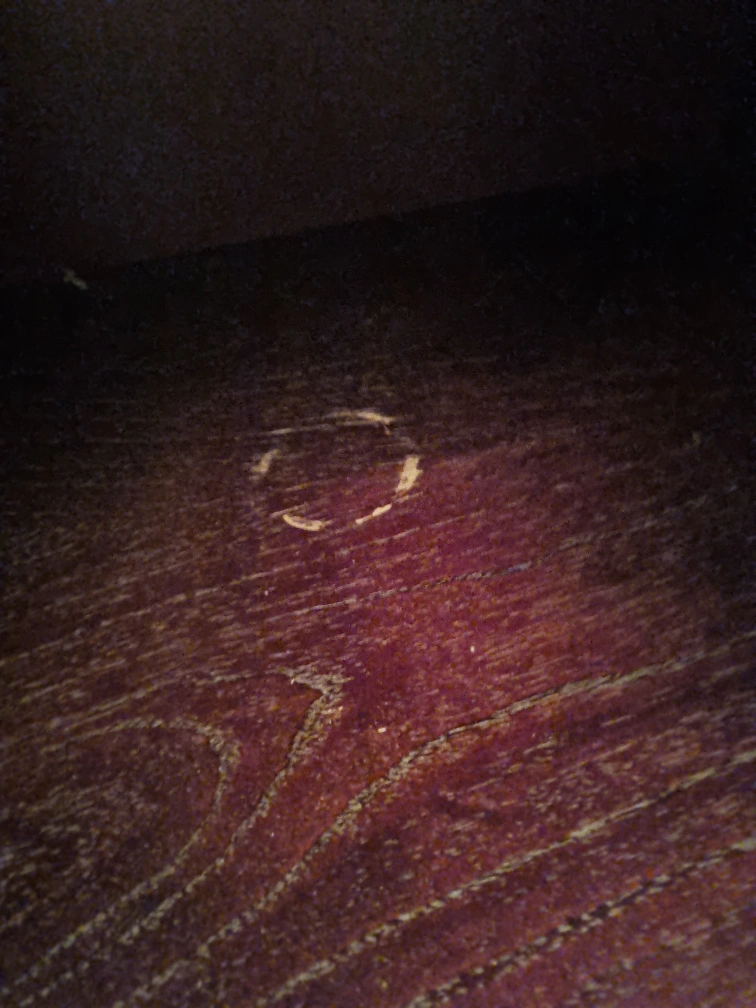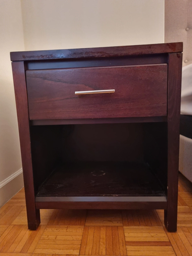 Two large nightstands, dark wood finish. One drawer, open shelf below. Minor wear.
