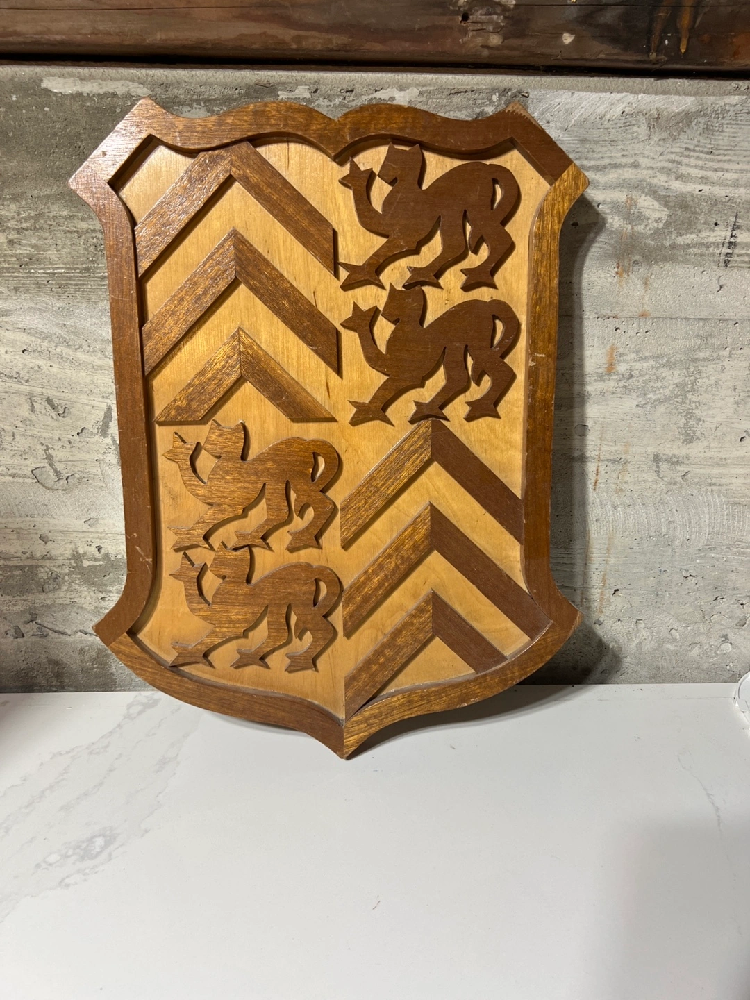 Unique wooden shield-shaped wall décor. Intricate carvings feature a chevron pattern and stylized animal figures. Ready to hang. Adds character to any room.