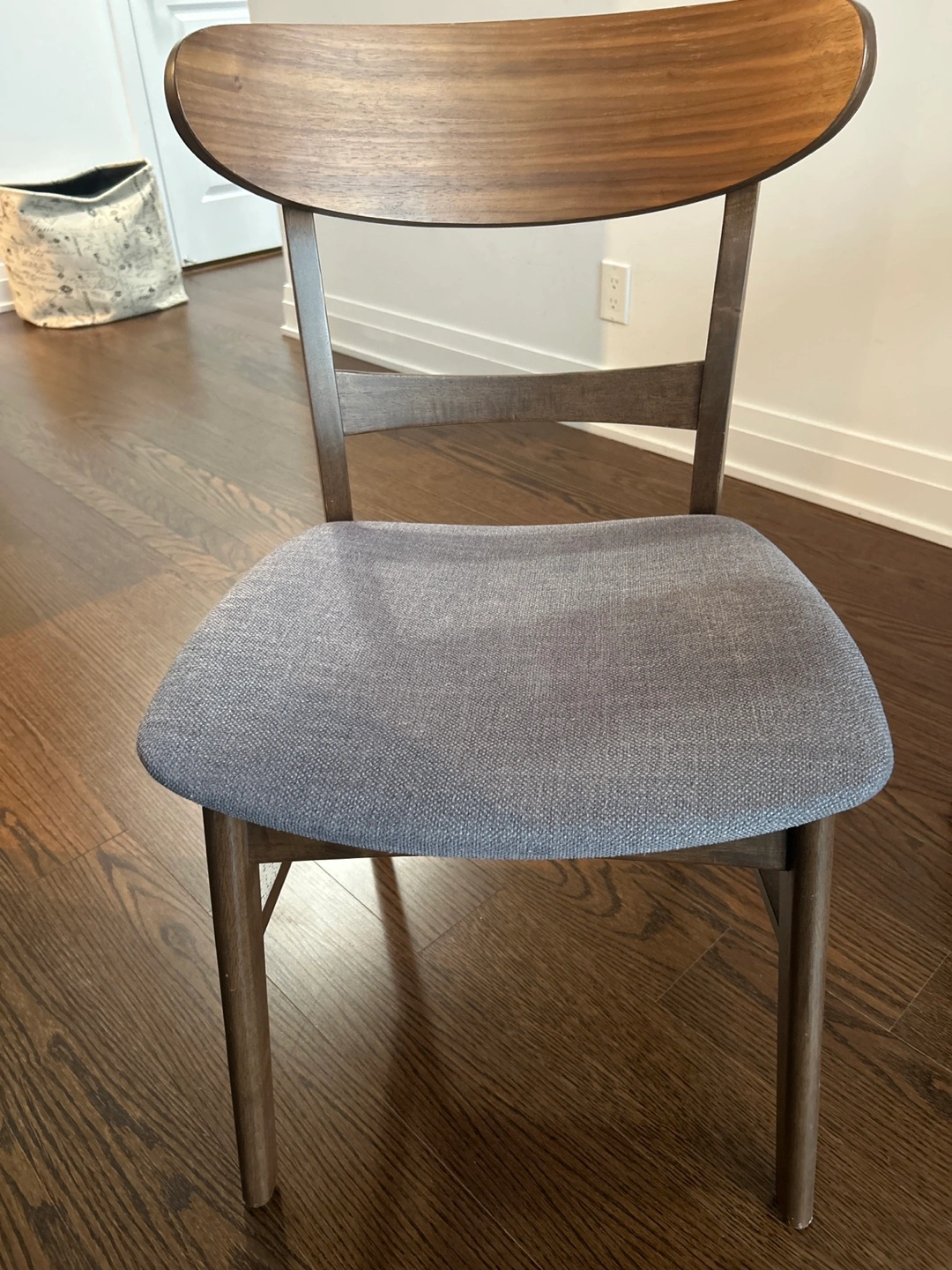 Stylish dining chair. Features a curved wooden back and grey fabric seat. Solid wood legs. Excellent for modern or mid-century homes. Set of four
