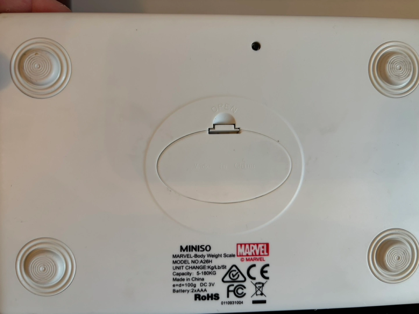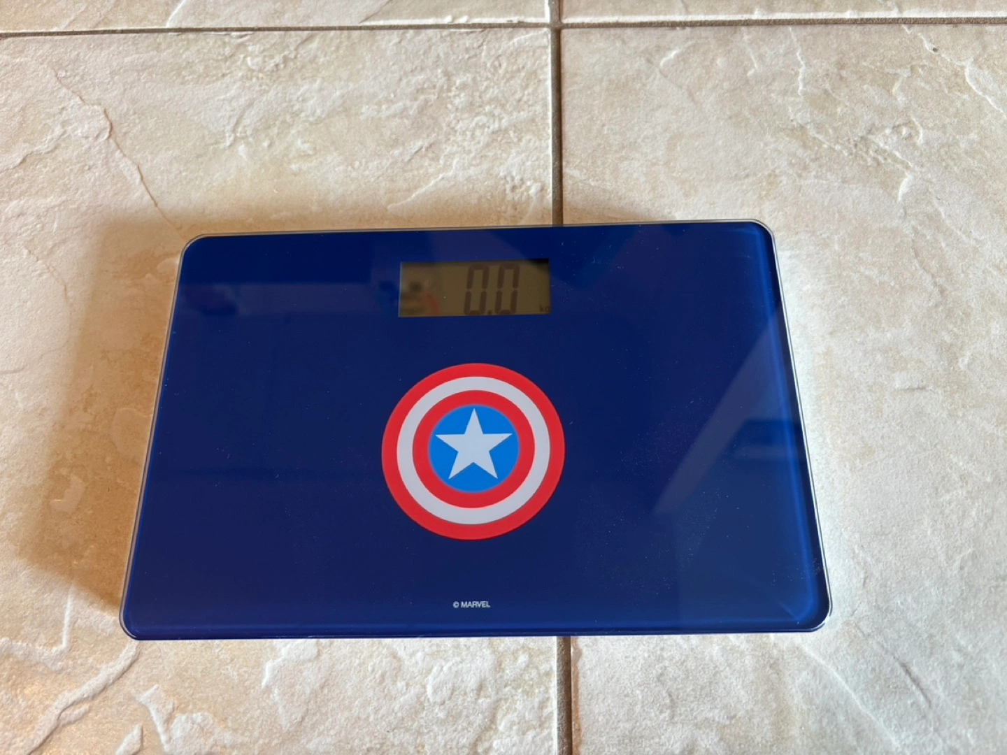 Digital bathroom scale. Features Captain America's shield. Blue colour. Measures weight in kilograms.