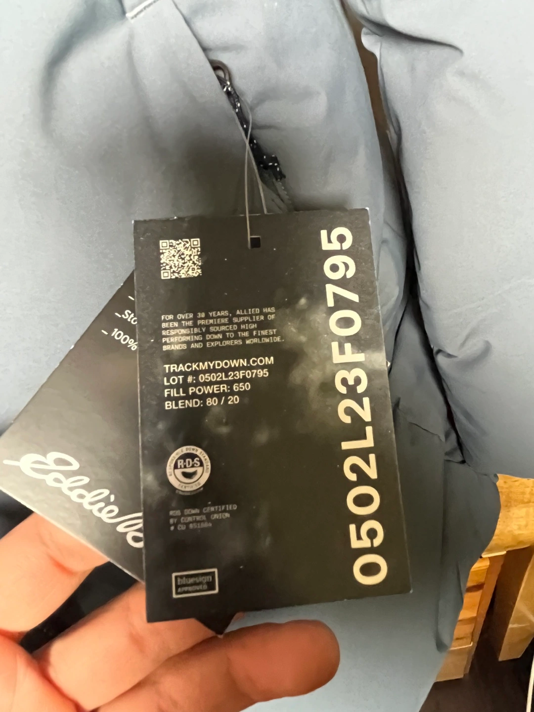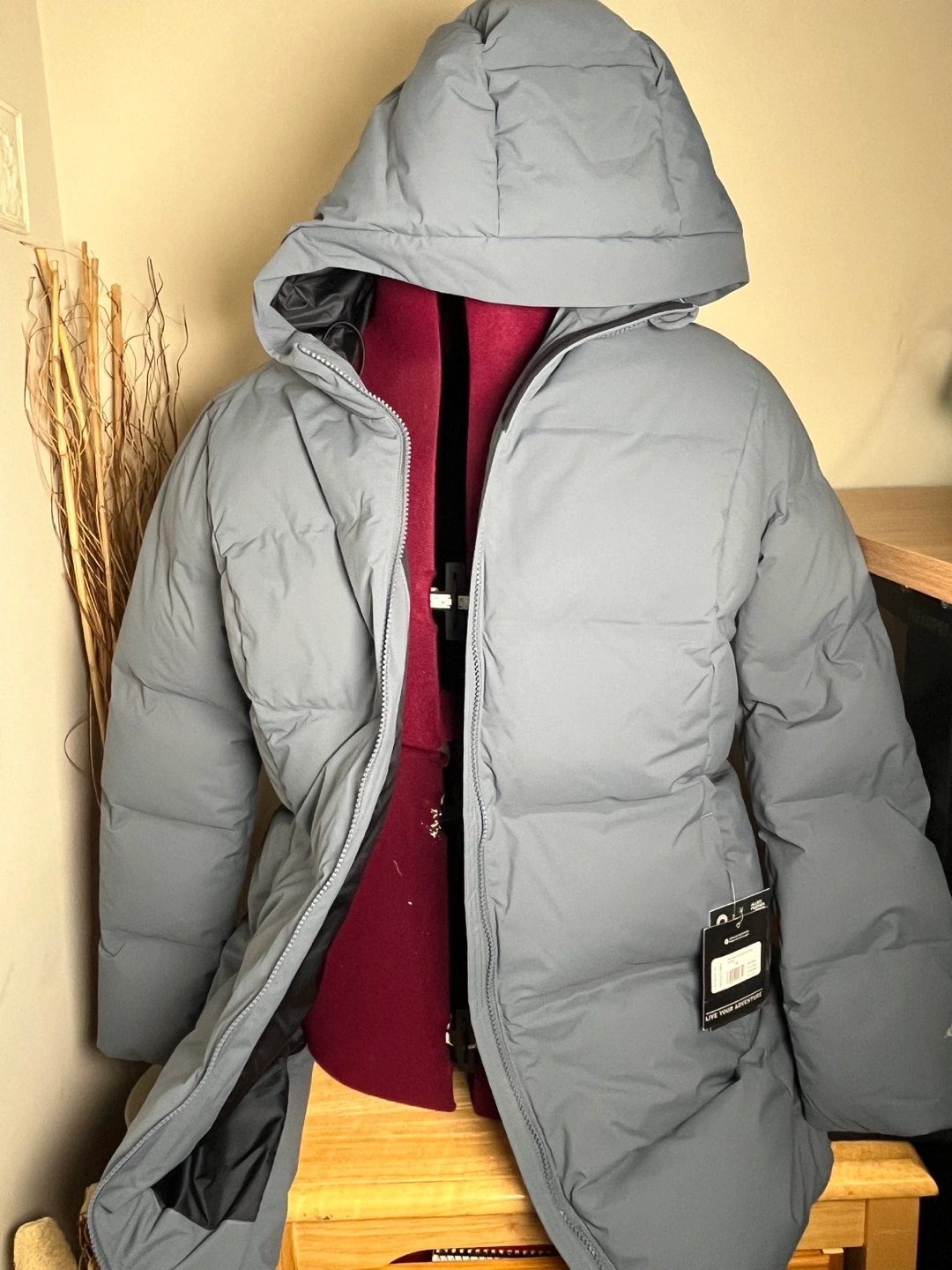 Women's Eddie Bauer Glacier Peak Sea down puffer jacket. Size XL. Grey colour. Features a hood. New with tags. 100% recycled nylon outer and 650 fill power down.