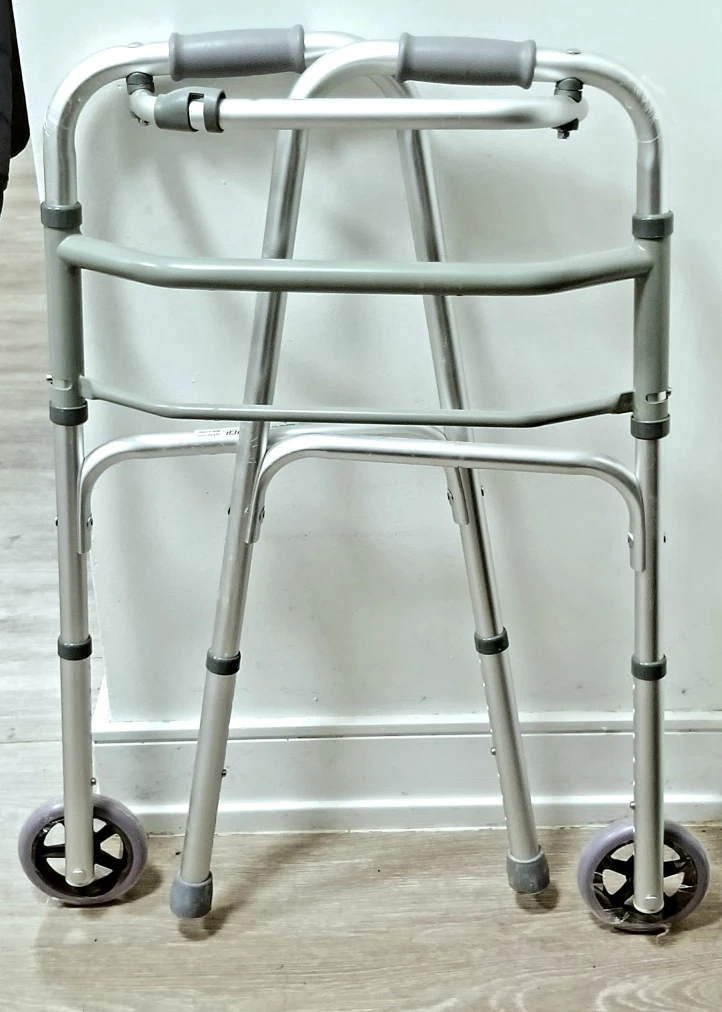 Foldable unused rollator walker. Aluminum frame. Small wheels. Grey handles. Great condition. The walkers height can be adjusted