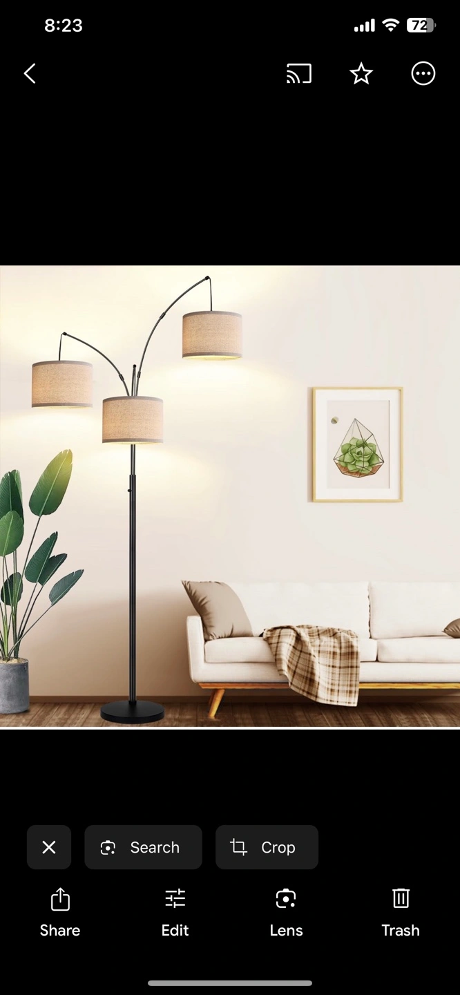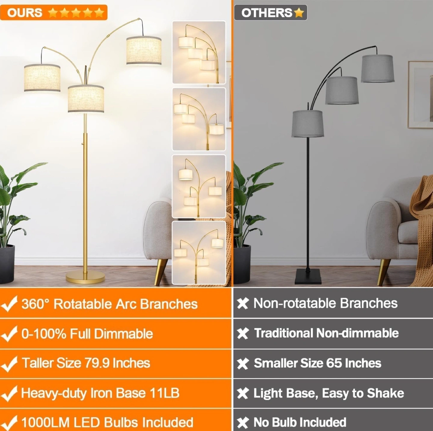 Three-lamp floor lamp. Features a rotary dimmer switch. Gold or black metal finish. Natural linen lampshades. Heavy-duty base. Bulbs included. Adjustable arc arms.