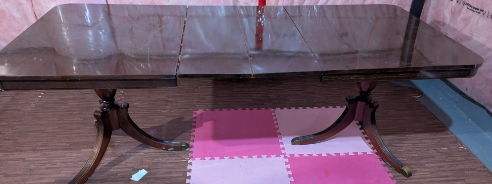 Beautiful dark wood extendable dining table. Features pedestal base and leaf extensions. Shows some wear consistent with age.