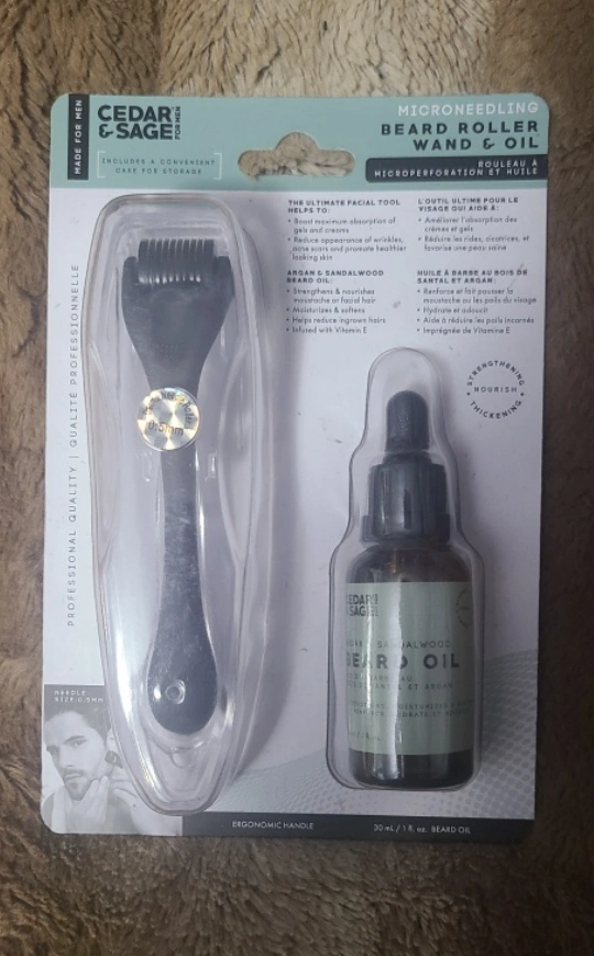 Brand new Microneedling beard roller and argan & sandalwood beard oil. Includes convenient case for storage. Ergonomic handle. Needle size 0.5mm. Strengthens and nourishes facial hair. Moisturizes and softens. Helps reduce ingrown hairs.